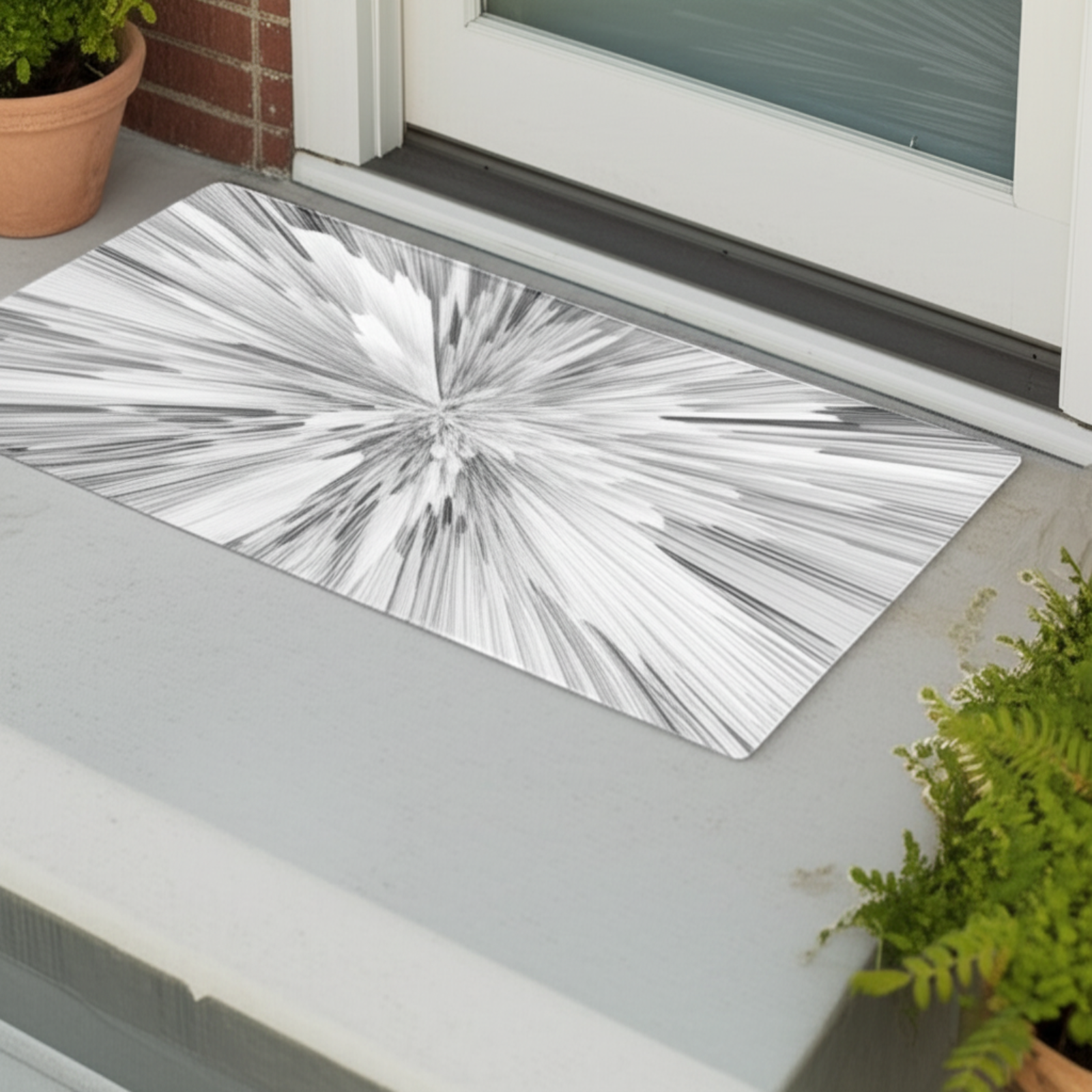 Welcome guests with a burst of modern style! This abstract burst doormat adds a contemporary touch to any entryway, instantly elevating your home's curb appeal. The eye-catching geometric design in classic black and white creates a striking focal point. Imagine this doormat greeting you and your visitors with its unique artistic flair, setting the tone for a stylish and welcoming home. Perfect for modern decor enthusiasts or anyone looking to add a touch of sophistication to their doorstep. Makes a thoughtful housewarming gift!