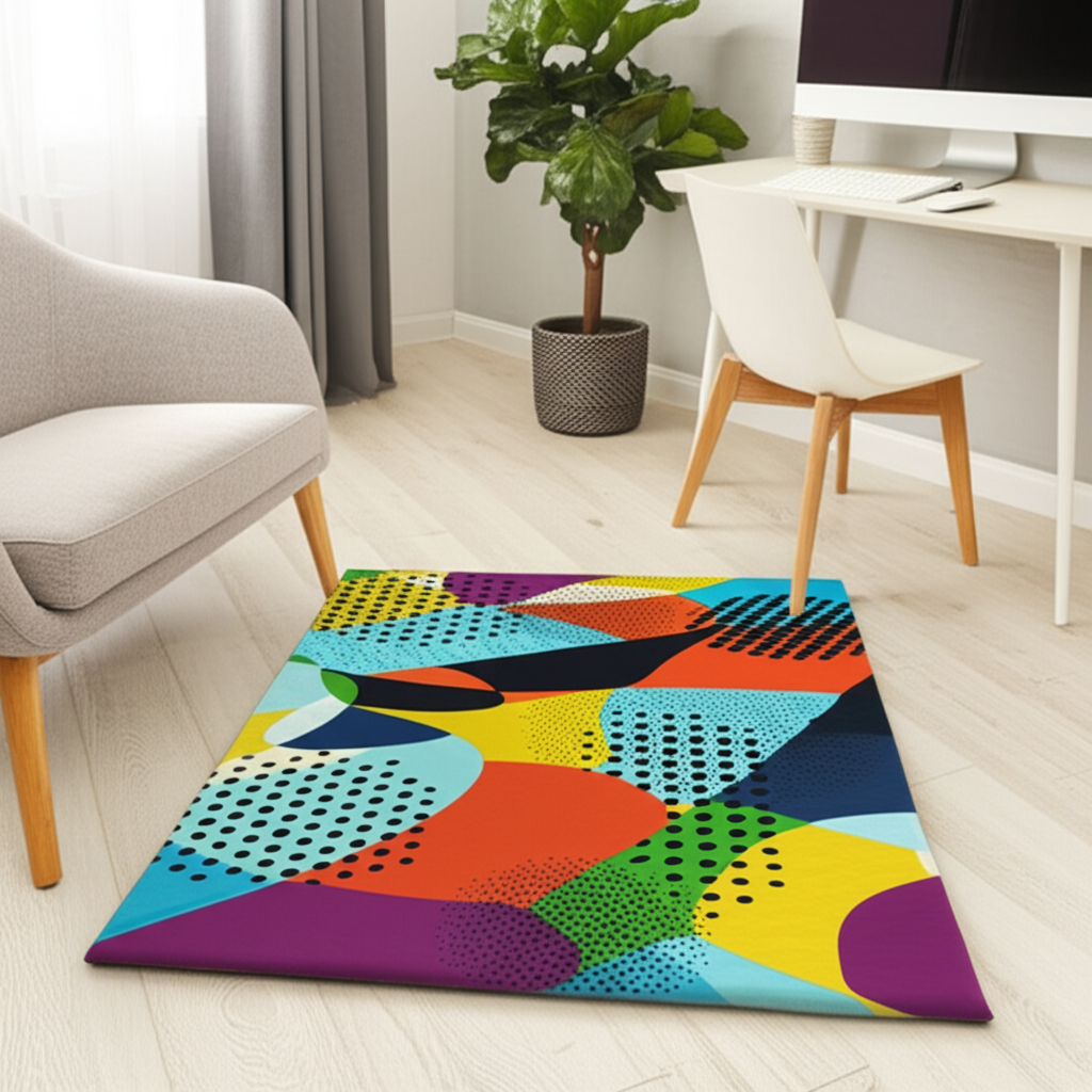 Transform your living space with this vibrant Abstract Geometric Premium Rug! This eye-catching rug features a playful design with bold shapes, bright colors, and fun patterns that will instantly liven up any room. Perfect for adding a touch of modern art to your home decor, this rug is an excellent choice for living rooms, bedrooms, or even home offices.