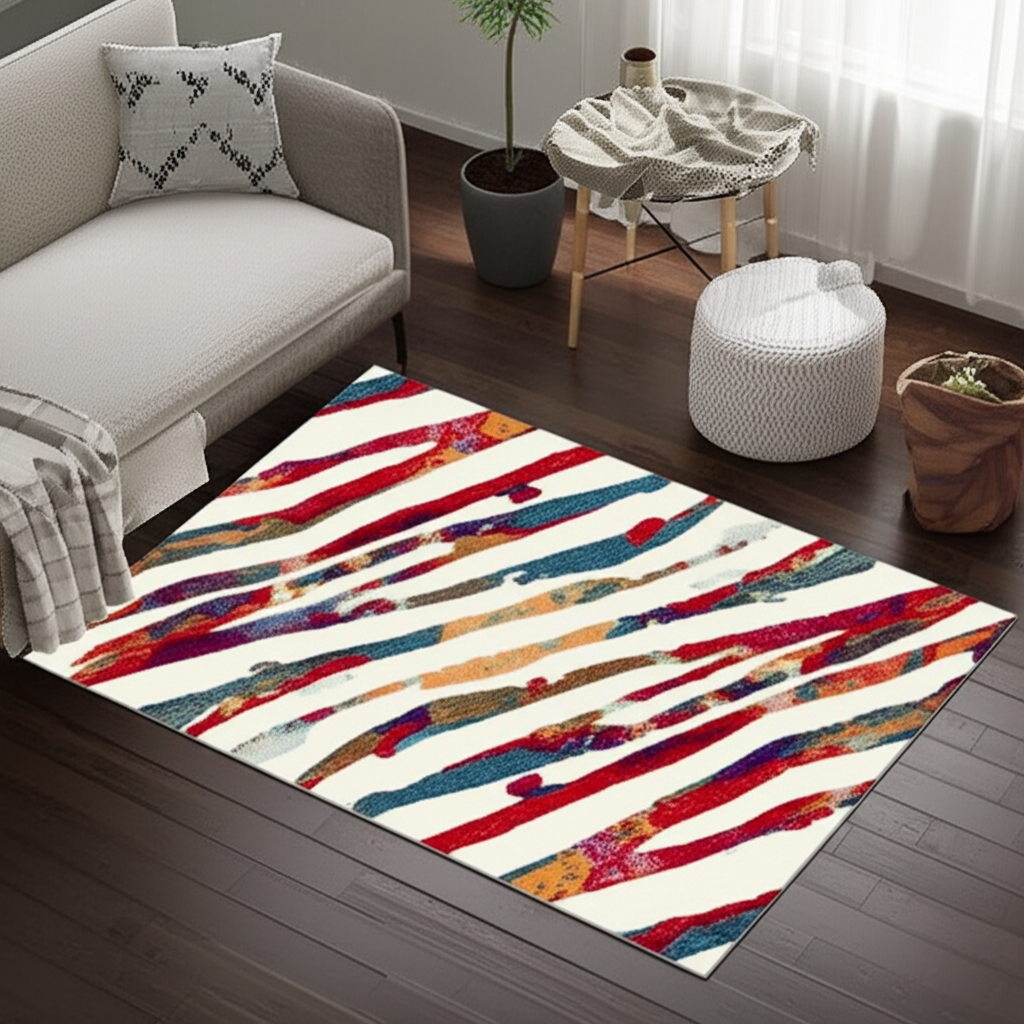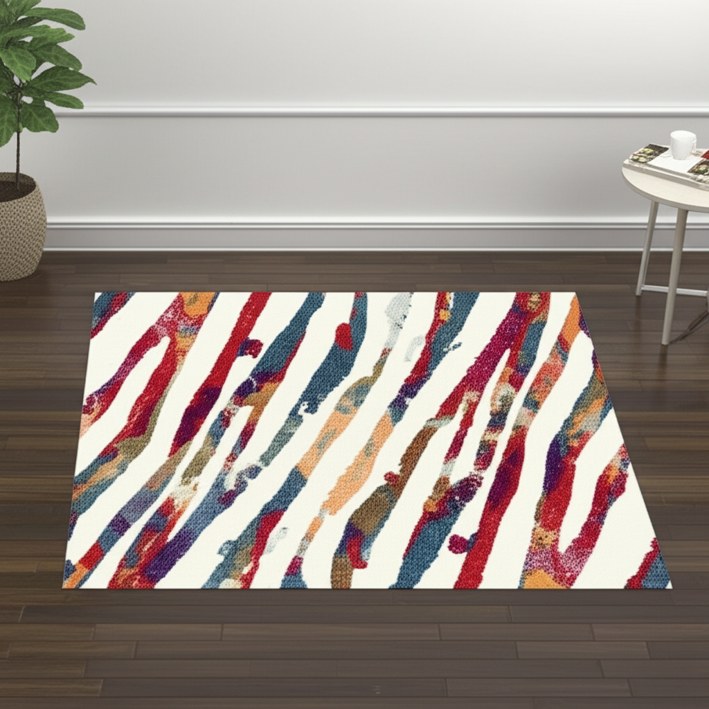 This rug features an abstract pattern of painted stripes. The stripes are in a variety of colors, including red, blue, purple, and orange, on a cream background. This rug would add a touch of modern style to any room.