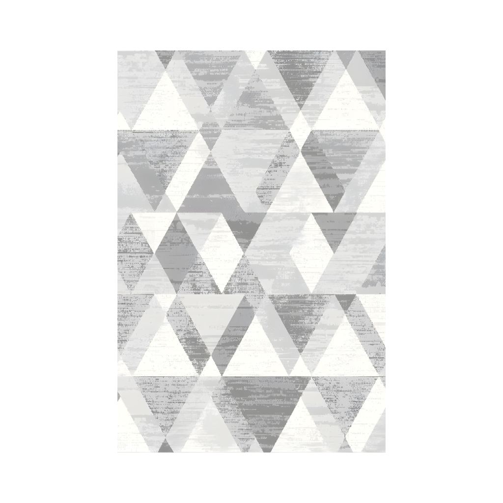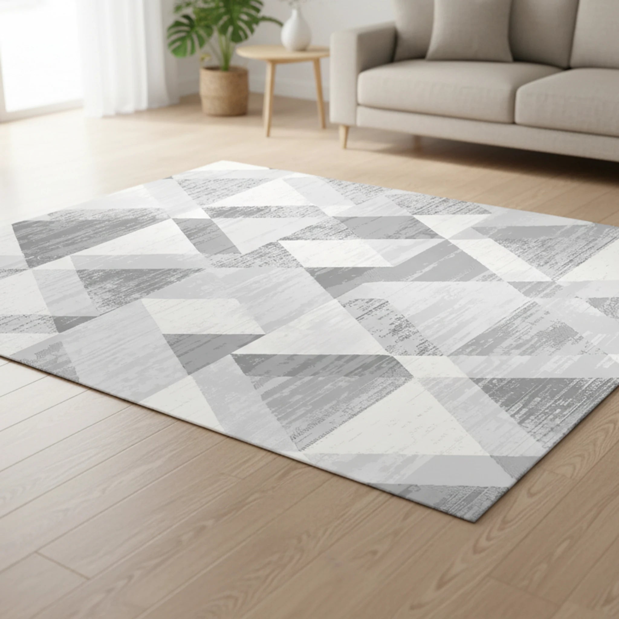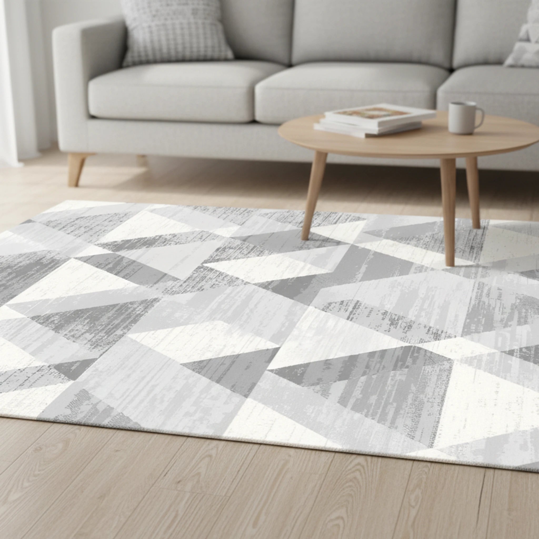 Bring modern geometric style to your living room with this abstract triangle rug. The gray patterned design adds a touch of contemporary texture to any space. Perfect as floor decor! This eco rug features an abstract geometric design with textured triangles in neutral grays and off-whites, creating a modern and sophisticated look.
