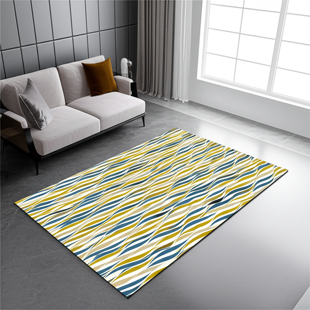 Transform your living space with our stunning, abstract wavy lines Premium Rug. As seen in the mockup, this rug features a captivating pattern of flowing lines in a harmonious blend of blue, gold, white, and brown tones. Its placement in a cozy living room with a blue sofa and wooden accents enhances the room's contemporary yet inviting atmosphere. This Premium Rug will become the centerpiece of your decor. Perfect as a housewarming gift, a stylish addition to a dorm room, or a treat for yourself, this rug brings both comfort and visual appeal to any room. Its unique design complements a variety of interior styles, from modern minimalist to eclectic bohemian.