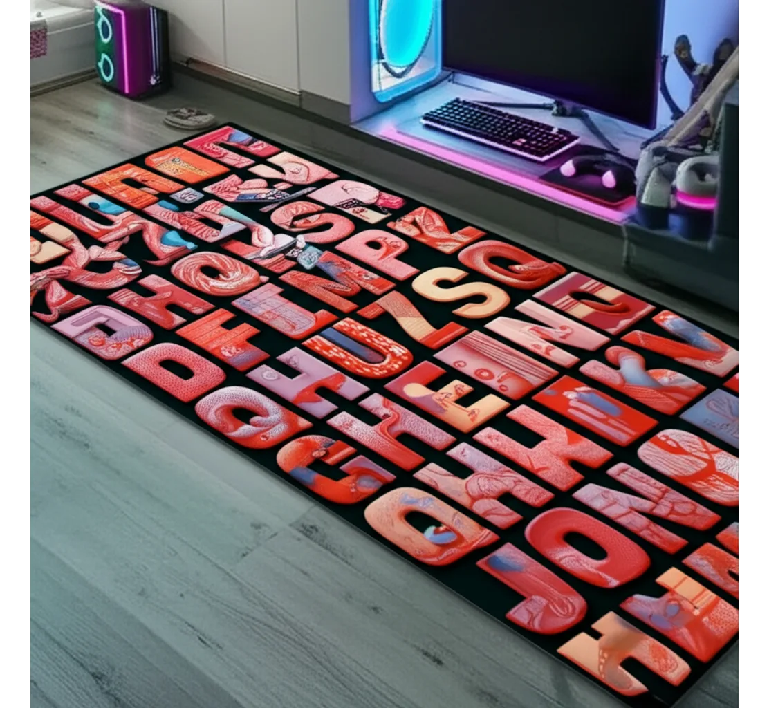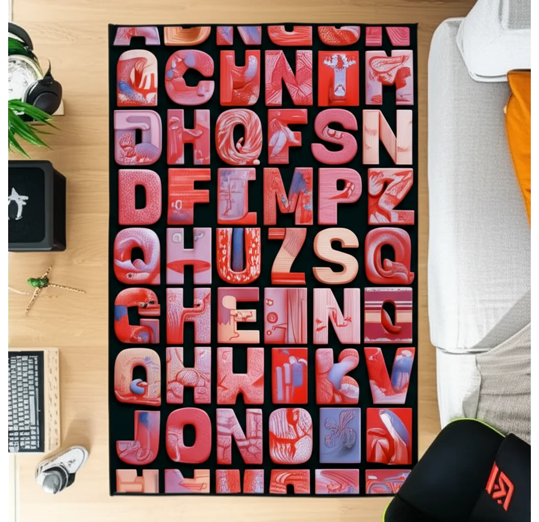 This rug features a coral alphabet design. The rug has a variety of shades of coral, red, and pale blue. It's a fun addition to a colorful living space.