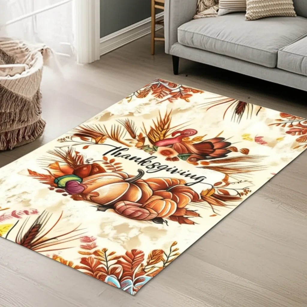 This rug features a festive autumn design, complete with pumpkins and fall foliage. The color palette is warm and inviting, with shades of orange, brown, and gold. It would add a cozy and stylish touch to any room during the Thanksgiving season.