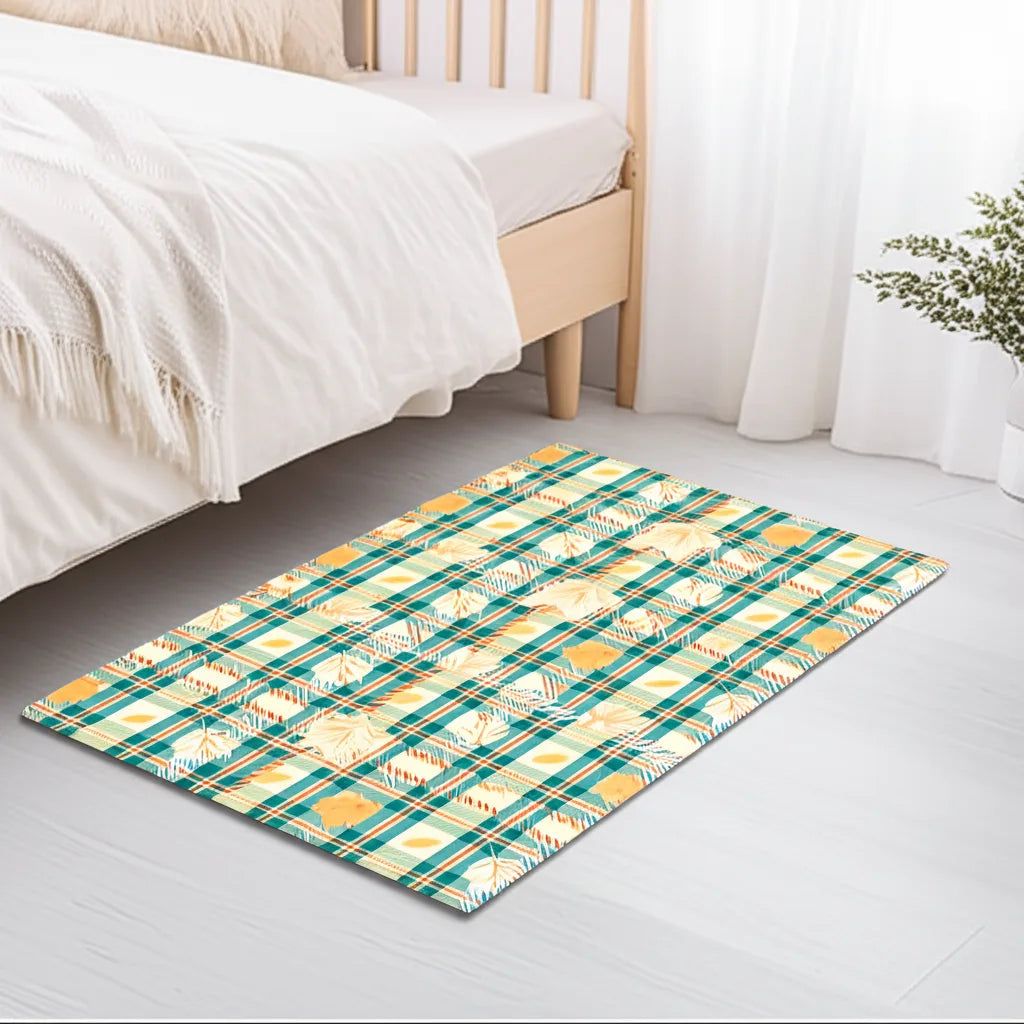 This rug features a colorful plaid design with autumn leaves. The colors include shades of green, red, blue, and orange, creating a warm and inviting atmosphere. It's the perfect way to add a touch of seasonal charm to any room.