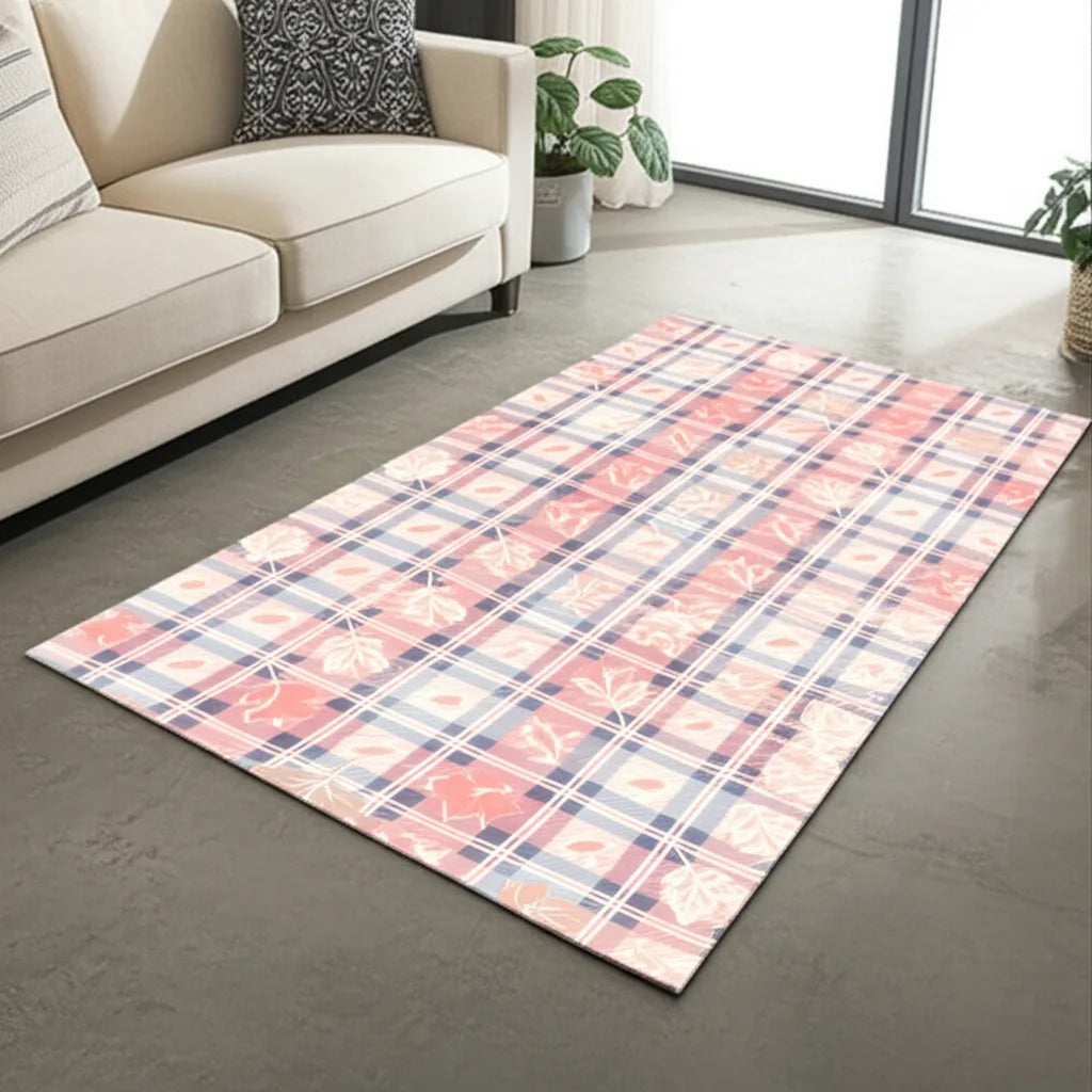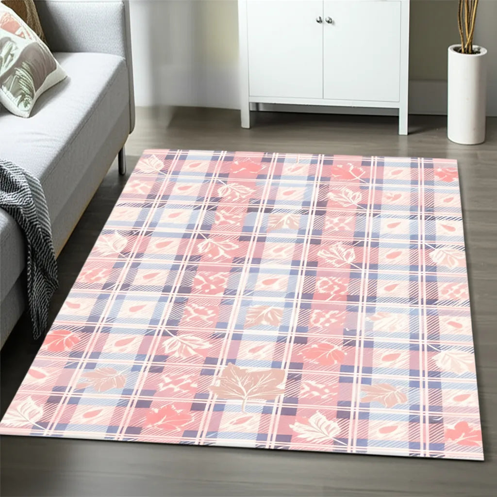 This rug features a charming plaid design in pastel pink, coral, and blue. Delicate leaf patterns are scattered throughout, giving it a cozy and inviting autumn feel. Perfect for adding a touch of warmth and style to any room.