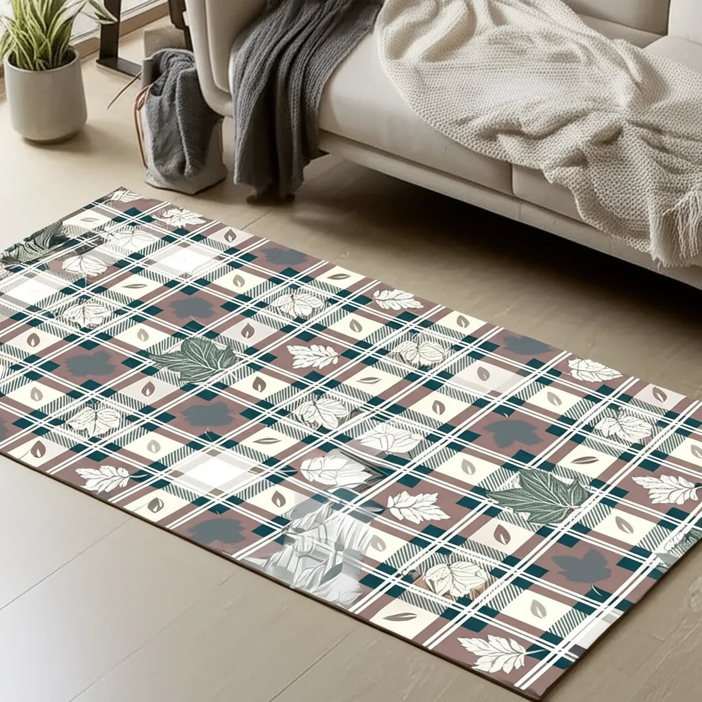 This rug features a lovely plaid pattern with superimposed leaf shapes. The color palette includes brown, cream, and teal. This piece would bring a touch of cozy, rustic charm to your home.