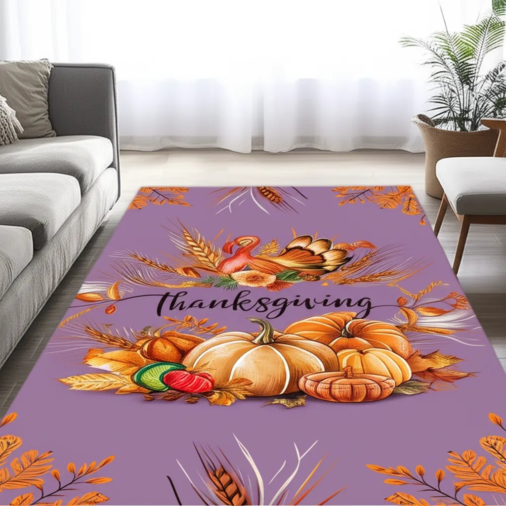 This Thanksgiving-themed rug features seasonal elements like pumpkins, wheat, and fall leaves, all in warm autumnal tones. The soft violet backdrop allows the orange, beige and brown hues to stand out. It would be a warm, inviting touch to your holiday decor.