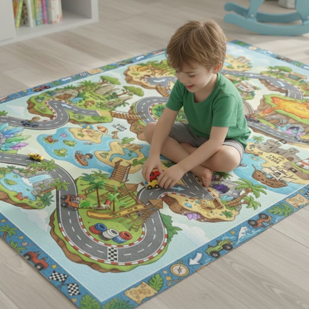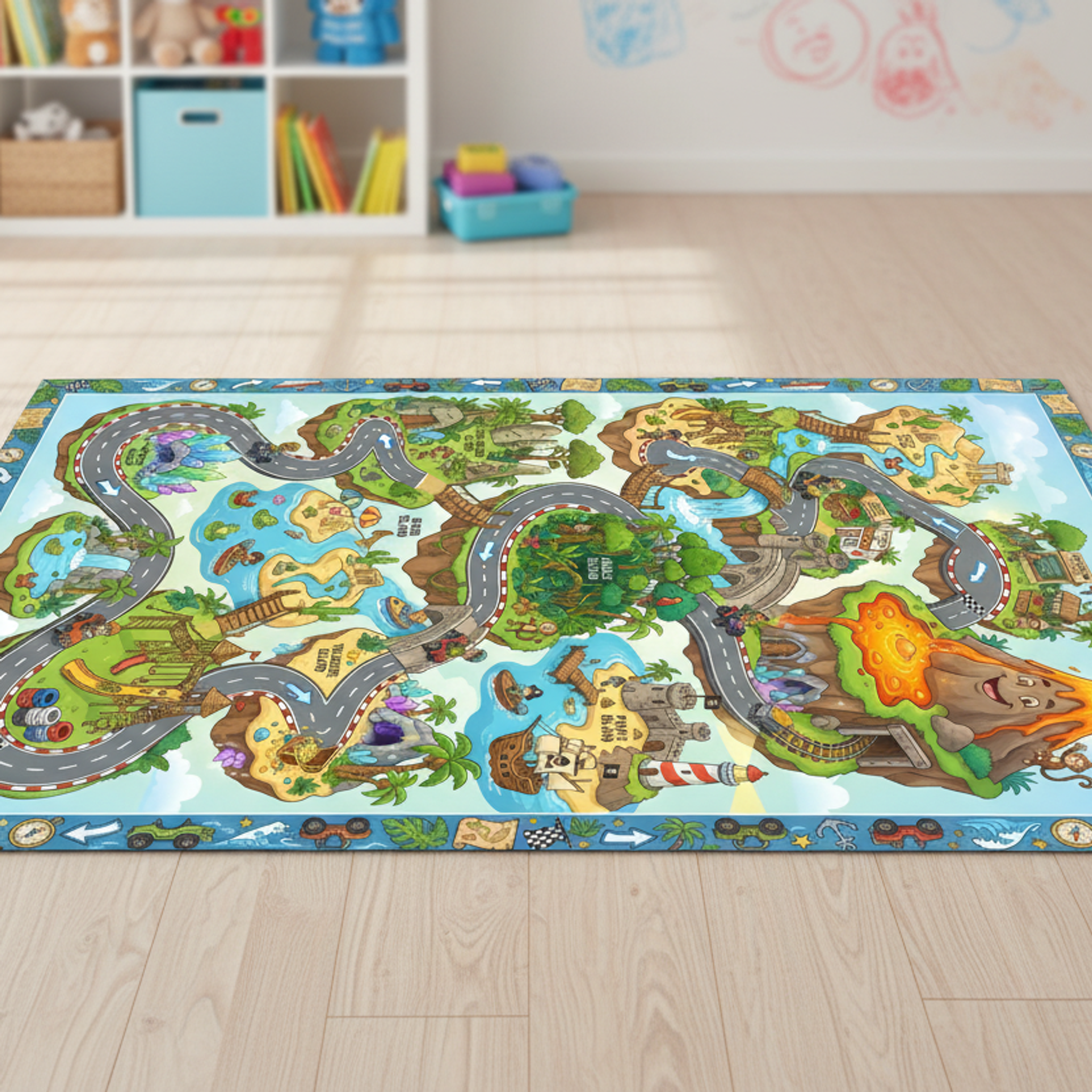Ahoy there, matey! Transform your little one's space into a playful paradise with this whimsical cartoon island Eco Rug. Imagine their delight as they embark on imaginative journeys across race tracks, around tropical foliage, and even near a smoking volcano! The playful, adventurous design, bursting with light green, sandy yellow, sky blue, cool gray, and vibrant orange, creates a cheerful and inviting atmosphere in any kids' room.