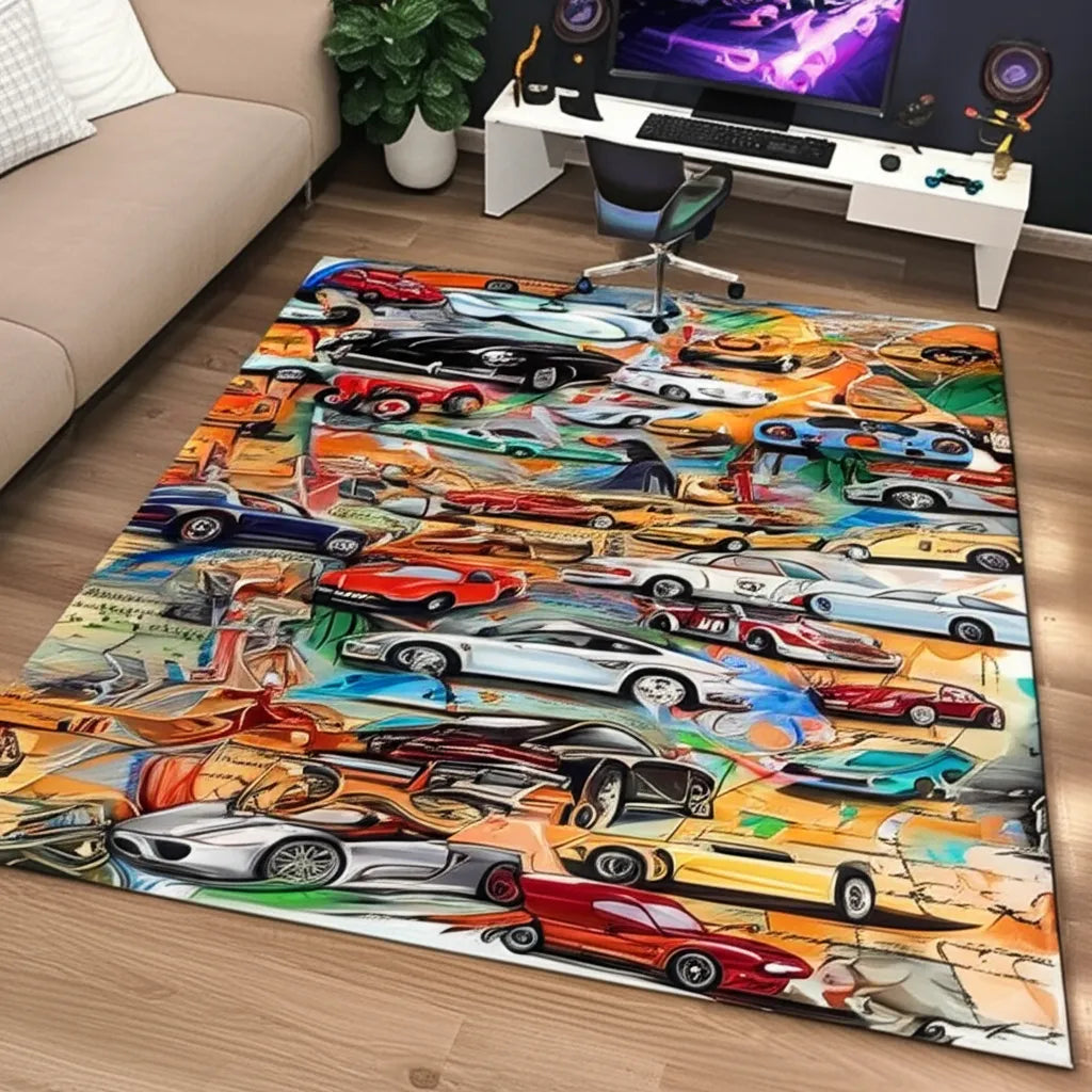 This rug features an array of classic cars in an artistic, painterly style. The design incorporates a variety of colors like red, white, yellow, blue, and green, creating a vibrant and dynamic look. This rug would be perfect for adding a touch of vintage charm and automotive flair to any room.