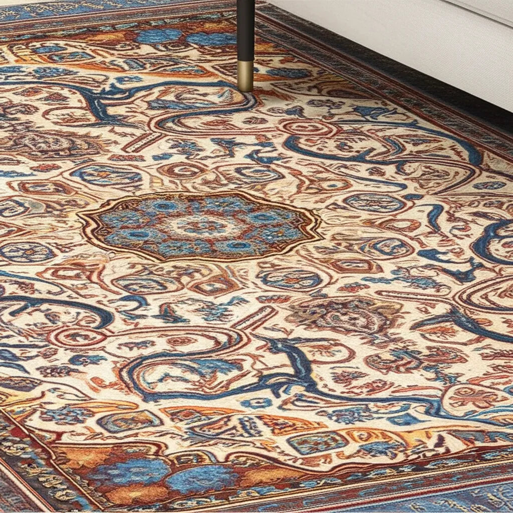 This classic rug features an ornate Persian-inspired design. The pattern includes a variety of floral and geometric elements in shades of beige, blue, and red. This rug would add a touch of traditional elegance to any room.
