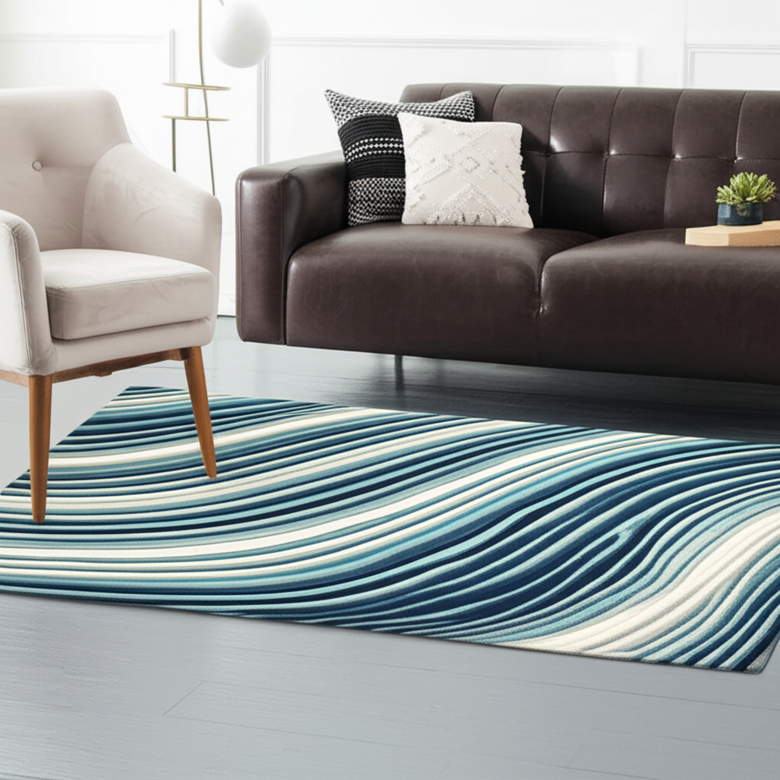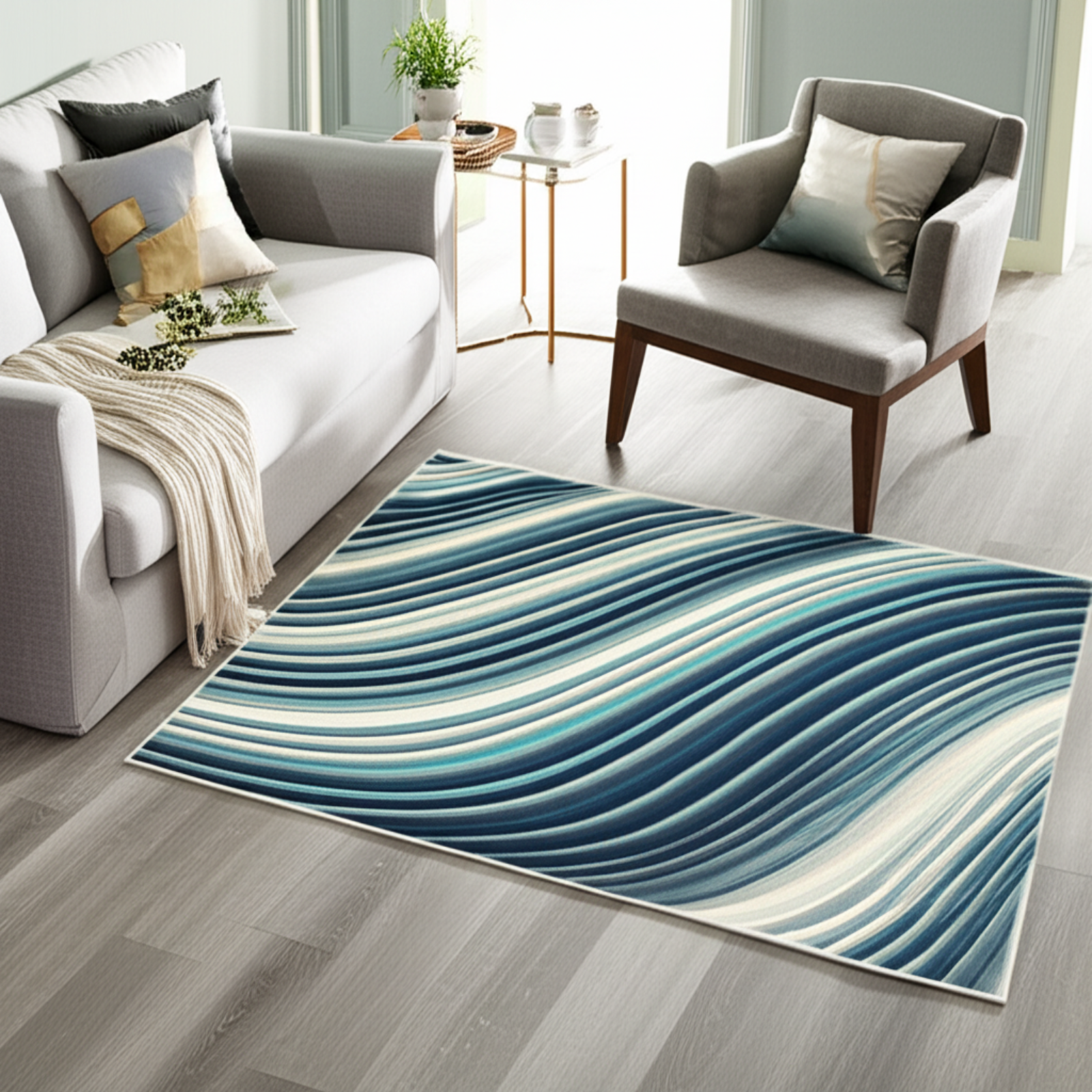 Transform your living space with the Coastal Wave Premium Rug, a stunning addition that brings the tranquility of the ocean into your home. Envision this rug nestled beneath your feet in a cozy living room, adding a touch of serene sophistication to your decor. The wavy striped pattern, rendered in cool blues and crisp whites, evokes the soothing rhythm of ocean waves, creating a calming atmosphere. This rug is more than just a floor covering; it's a statement piece that complements modern and coastal-themed interiors alike. Imagine it as the perfect housewarming gift for someone who loves the beach or as a thoughtful present for anyone looking to refresh their home with a touch of elegance. Its soft-touch surface invites you to relax and unwind, making it an ideal addition to any room where comfort is key. The non-slip polyester base ensures safety and stability, providing peace of mind for busy households. Crafted with meticulous attention to detail, the Coastal Wave Premium Rug offers both beauty and practicality. The high-resolution digital print ensures vivid, lasting colors that will brighten your space for years to come. Lightweight and durable, this rug is easy to move and maintain, making it a hassle-free addition to your home.