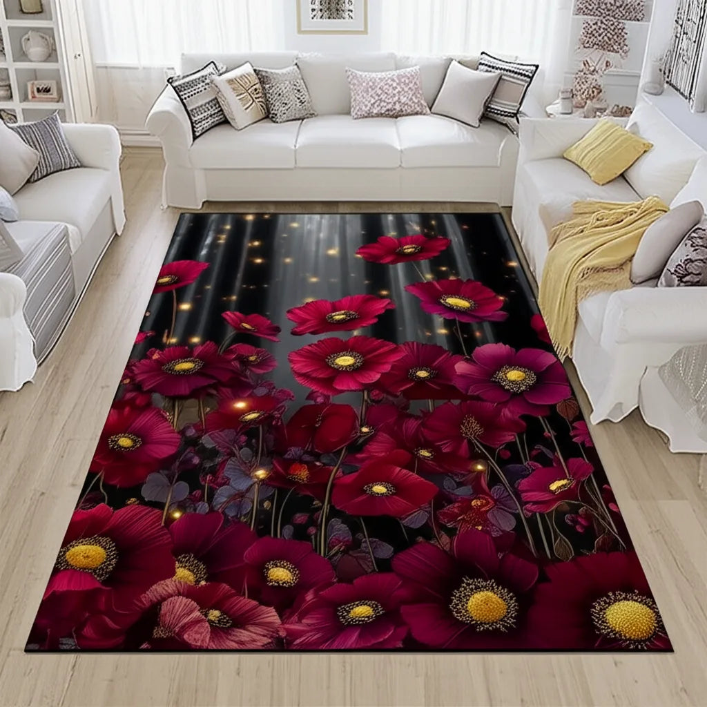 This rug features a dark, enchanting design with crimson flowers set against a backdrop of a dark forest. The golden accents add a touch of elegance, making it a captivating focal point for any room. It will add a touch of moody charm to your decor.