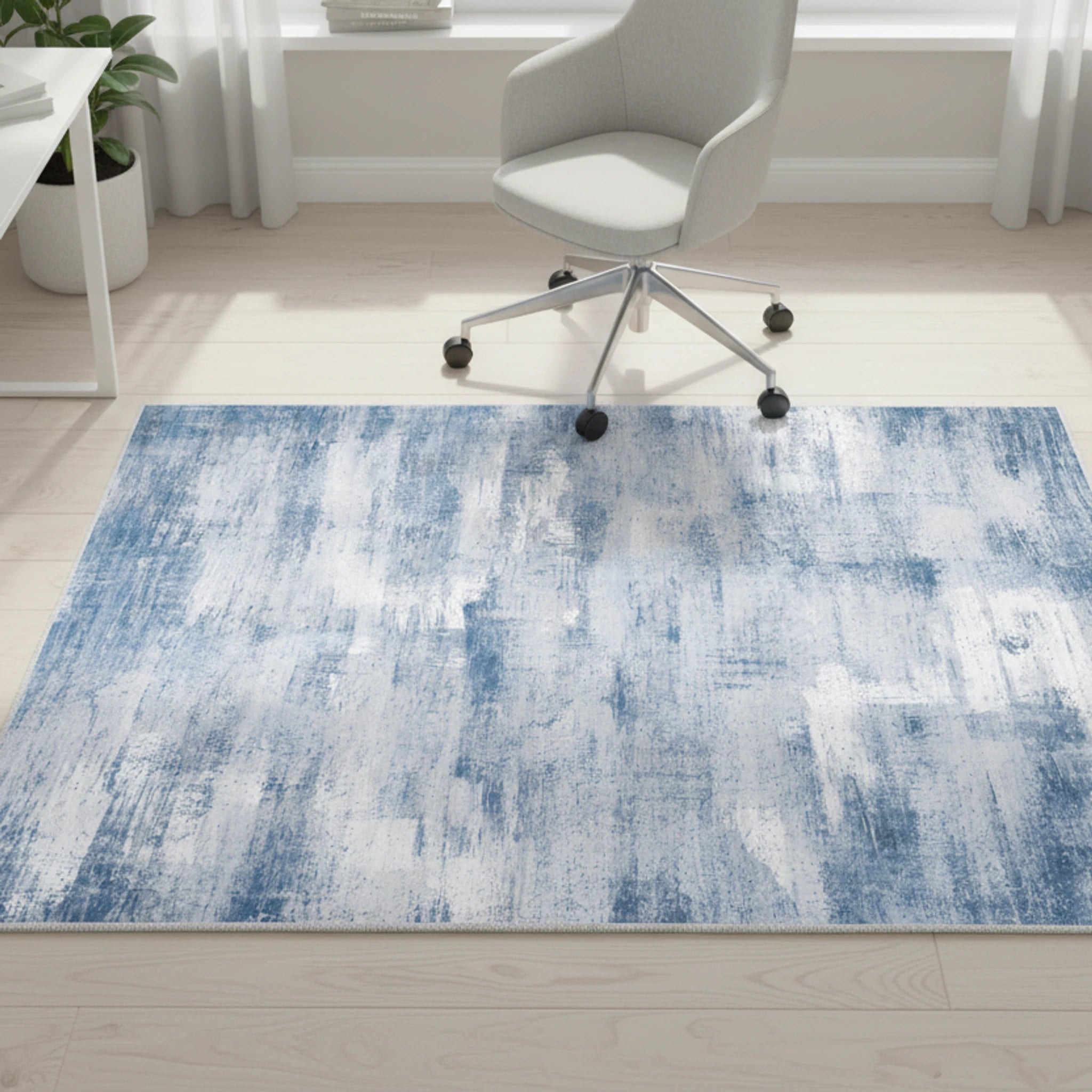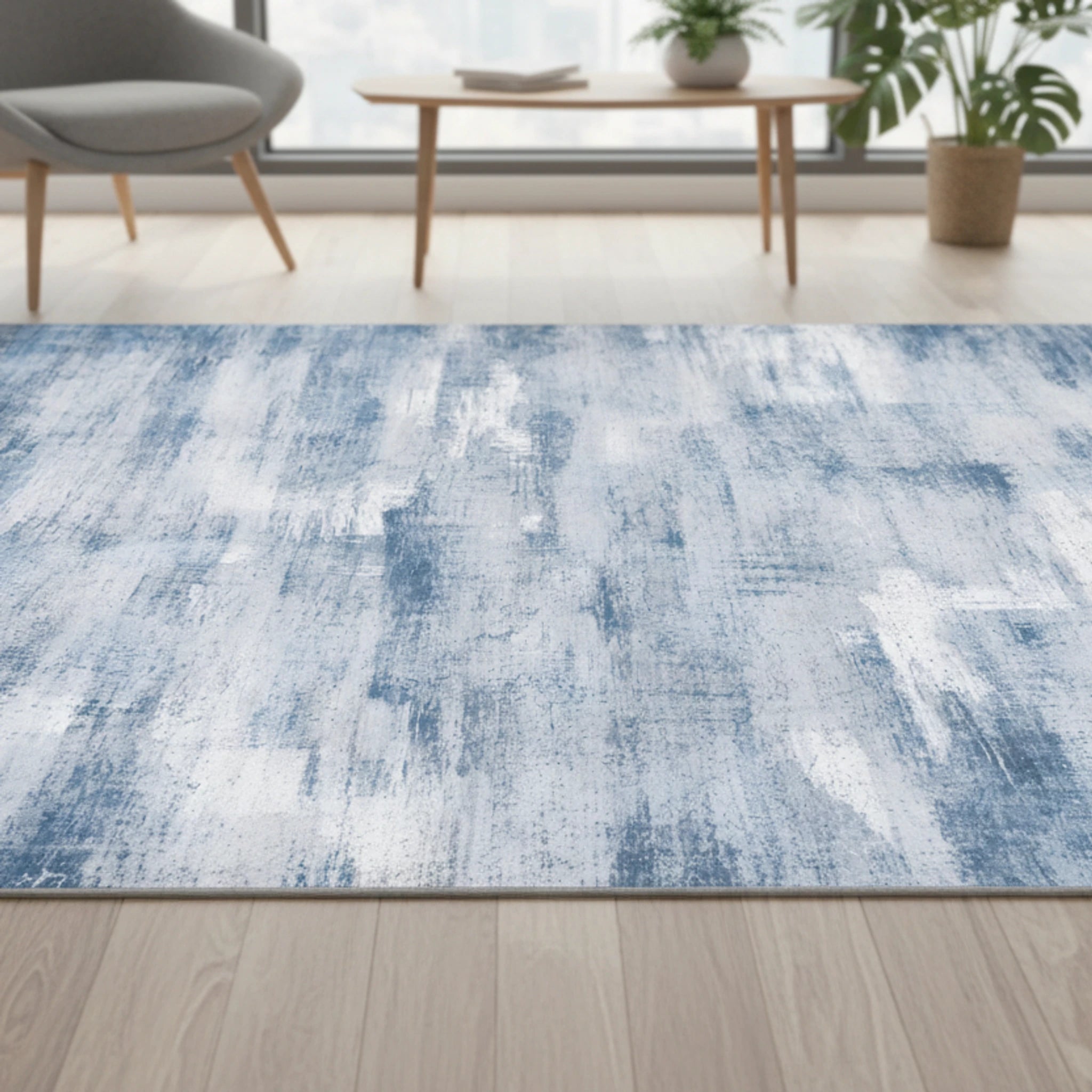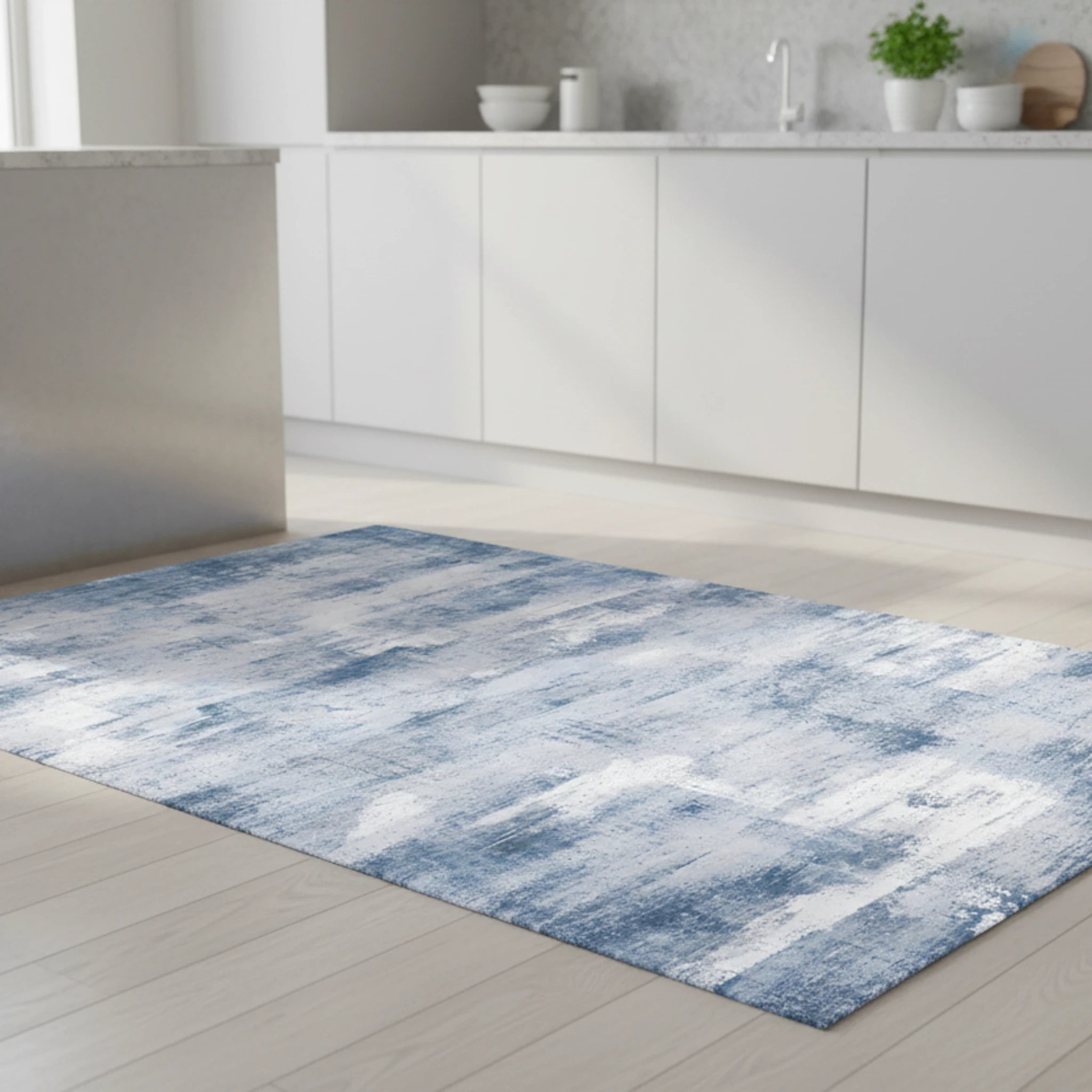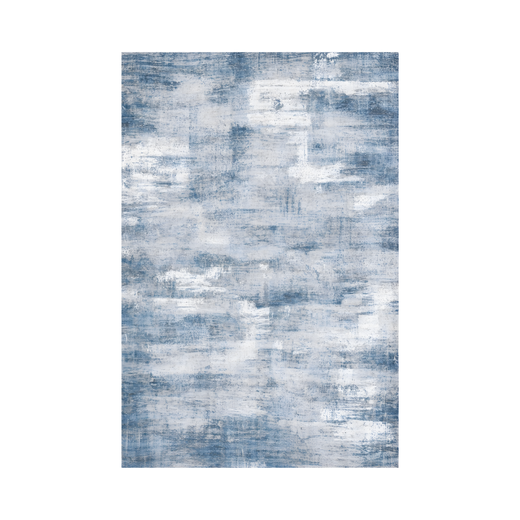 The rug features a blend of light gray-blue, off-white, and steel blue, creating a textured, subtly grunge aesthetic. The distressed paint effect adds depth and character to any room.