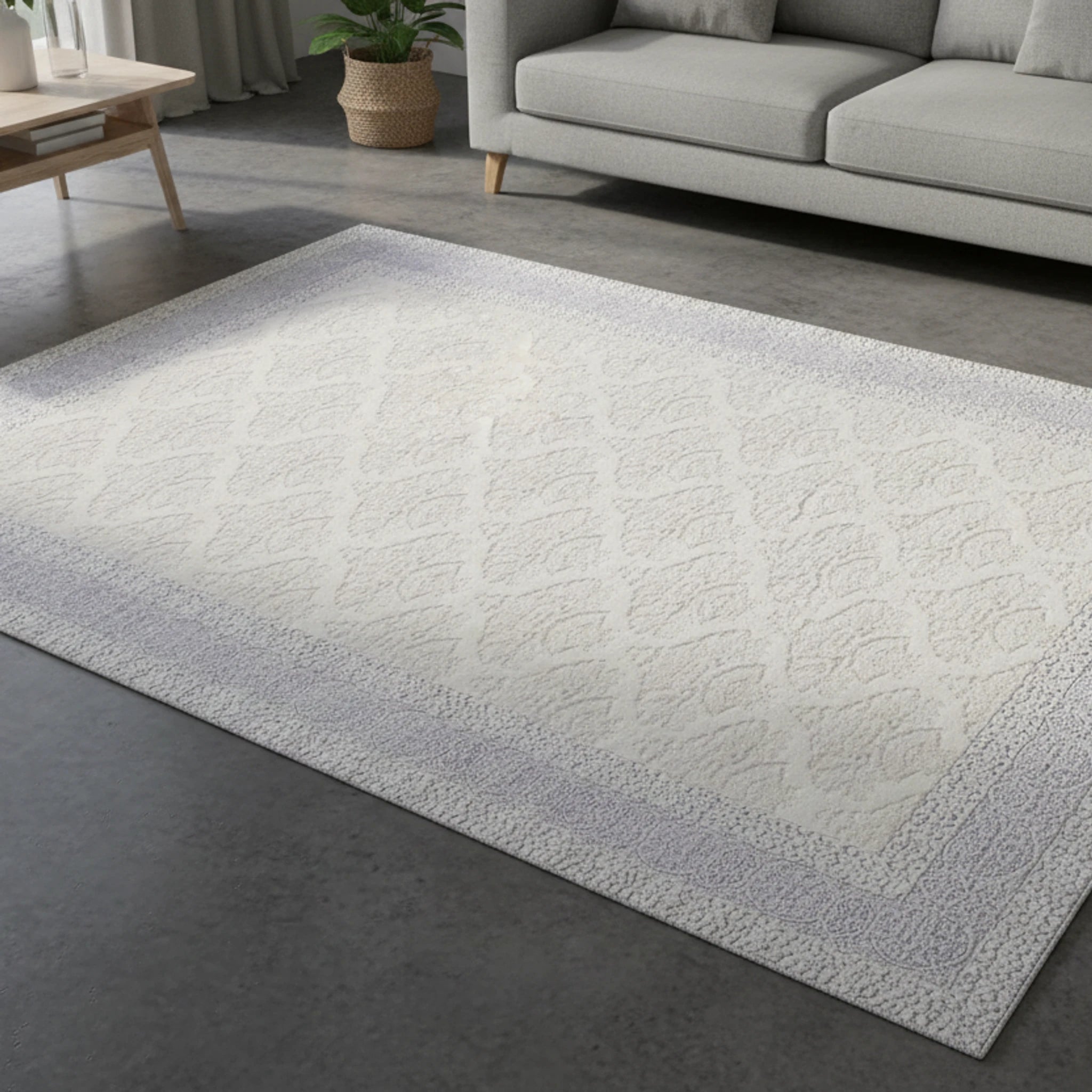 Adorn your living room with this elegant damask rug. The delicate floral patterns and lace border create a sophisticated focal point. This Eco Rug features a light gray and off-white palette, bringing subtle grace to any space.