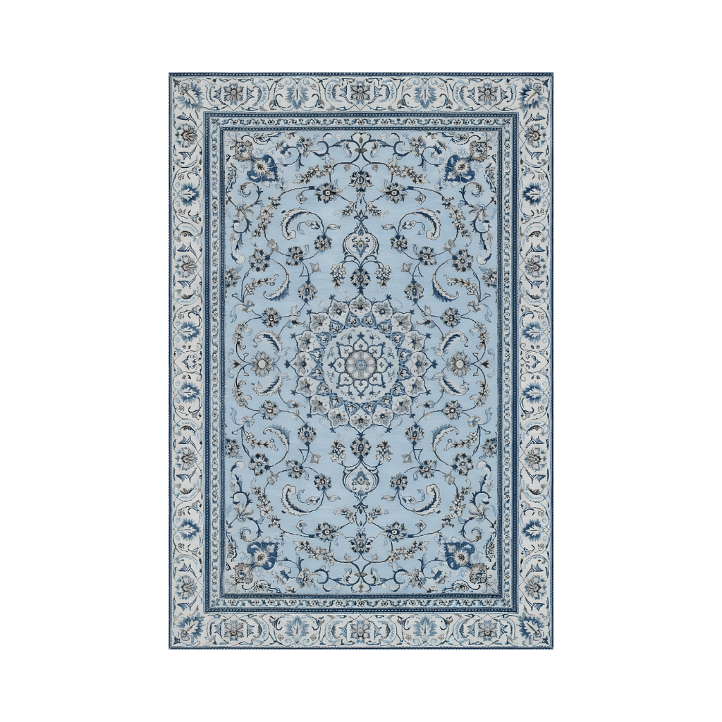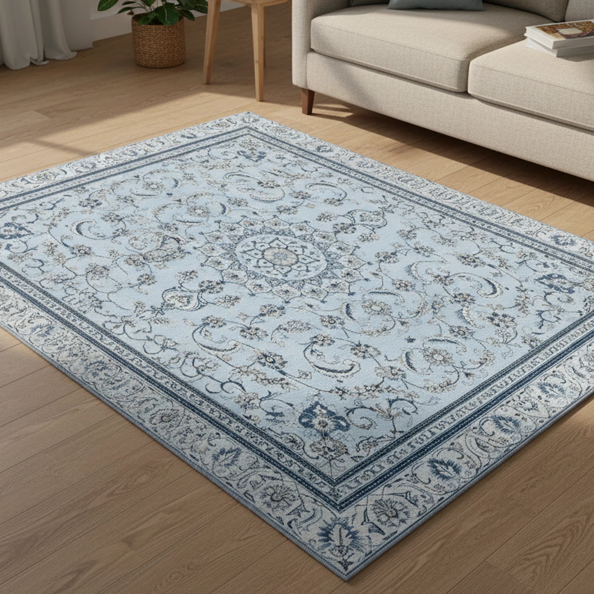 Enliven your living room with this elegant floral rug! Its arabesque medallion design brings a touch of tranquility and sophistication. The light blue and gray palette adds a calming presence to any space.
