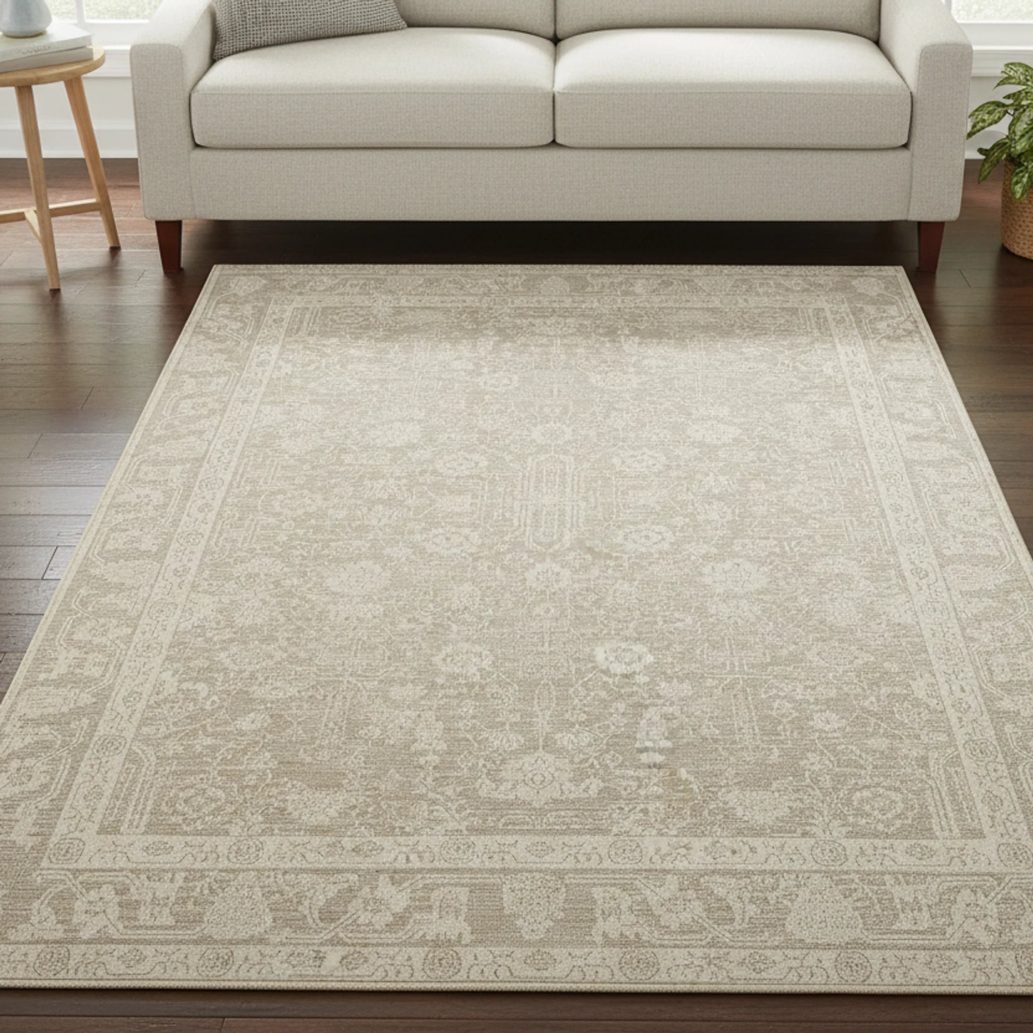 Bring subtle elegance to your living room with this floral rug. Its faded beige and off-white palette creates a calming atmosphere, perfect for a serene space. The central medallion and delicate scrollwork add a touch of vintage charm.