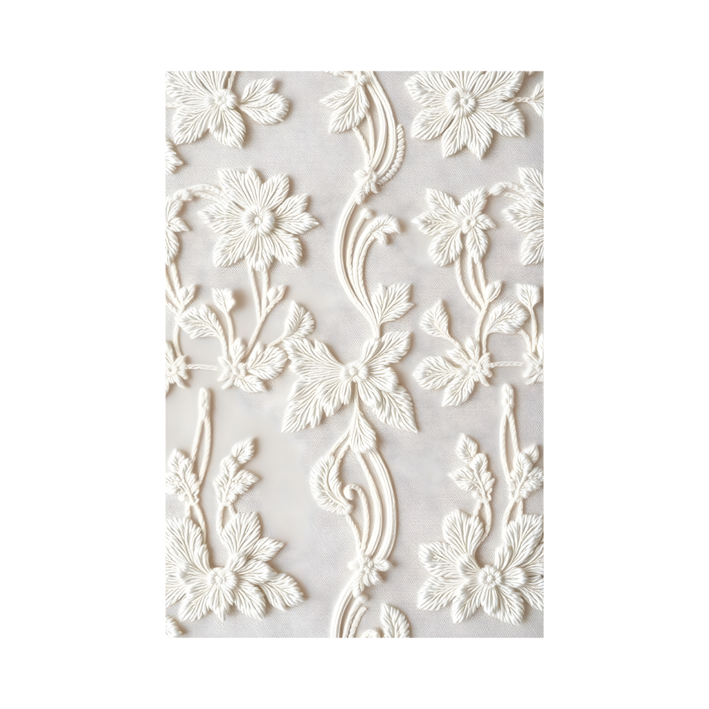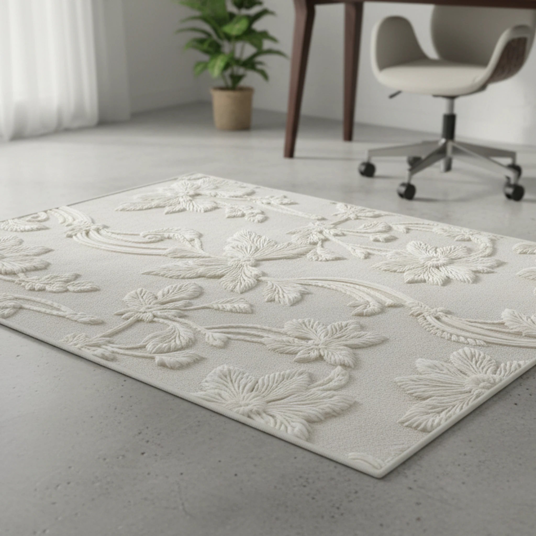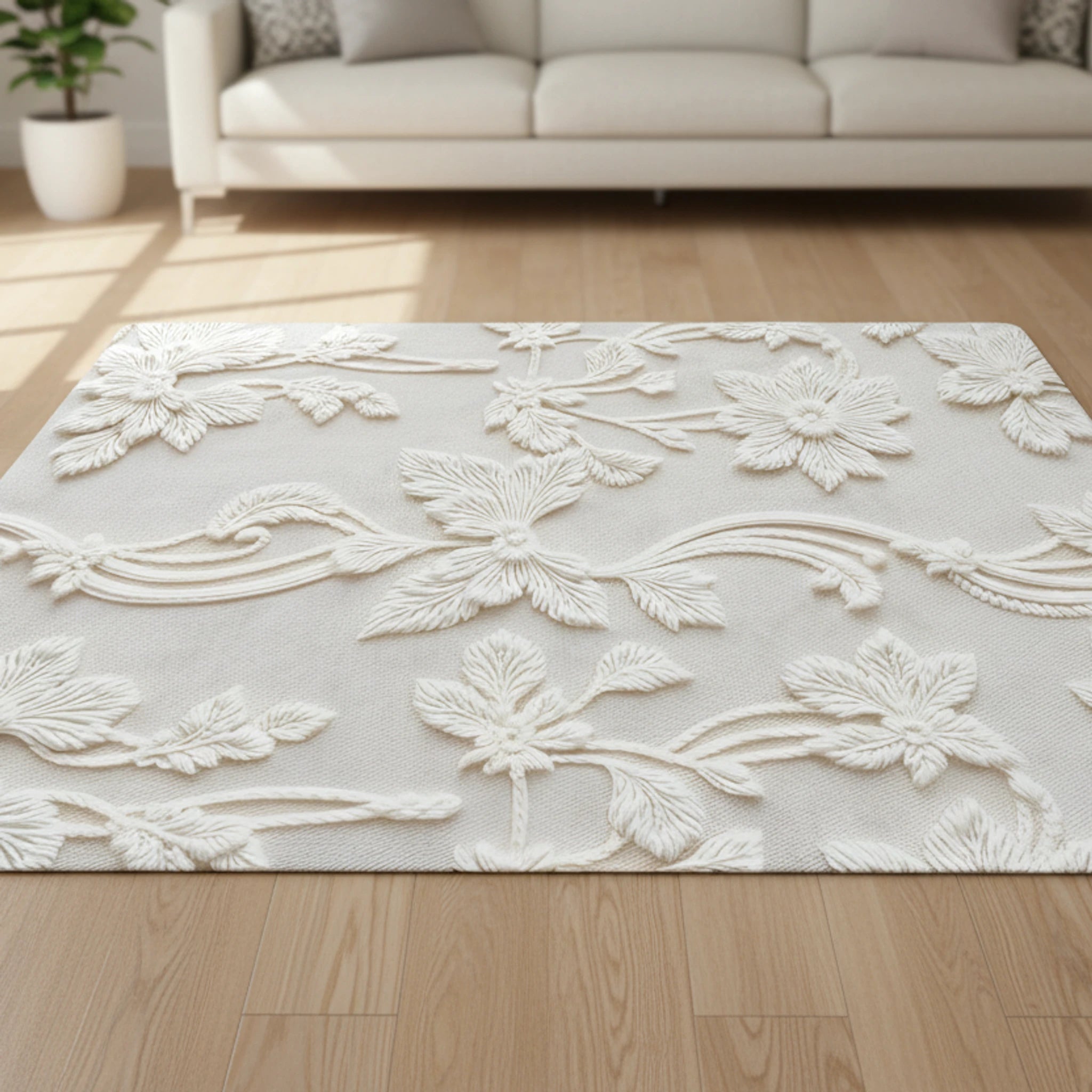 The off-white and white color palette creates a serene and inviting atmosphere, enhanced by the textured, embossed effect. This rug embodies a sophisticated and delicate aesthetic, perfect for creating a relaxing and stylish space.