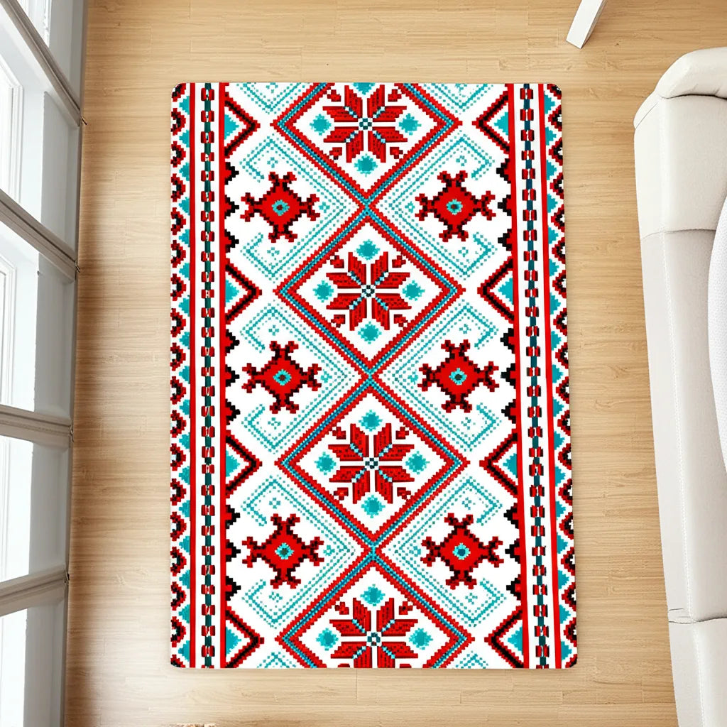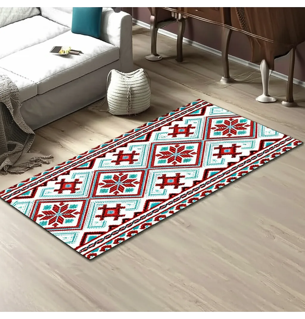 This rug features a vibrant red, black, and teal pixelated pattern on a white background. This geometric design will add a touch of cultural flair to any room. The intricate detailing and bold color palette make it a stunning focal point for your space.