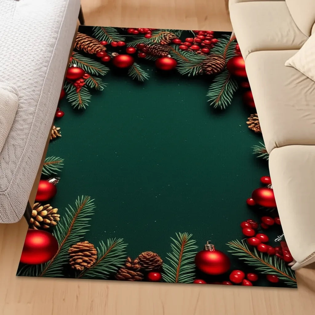 This festive rug features a dark green backdrop adorned with pine sprigs and red ornaments. The design also includes pinecones and berries for a complete Christmas look. This rug will bring the Christmas spirit to any room.