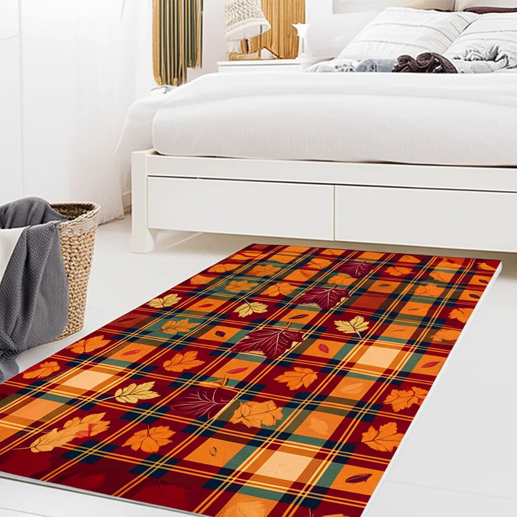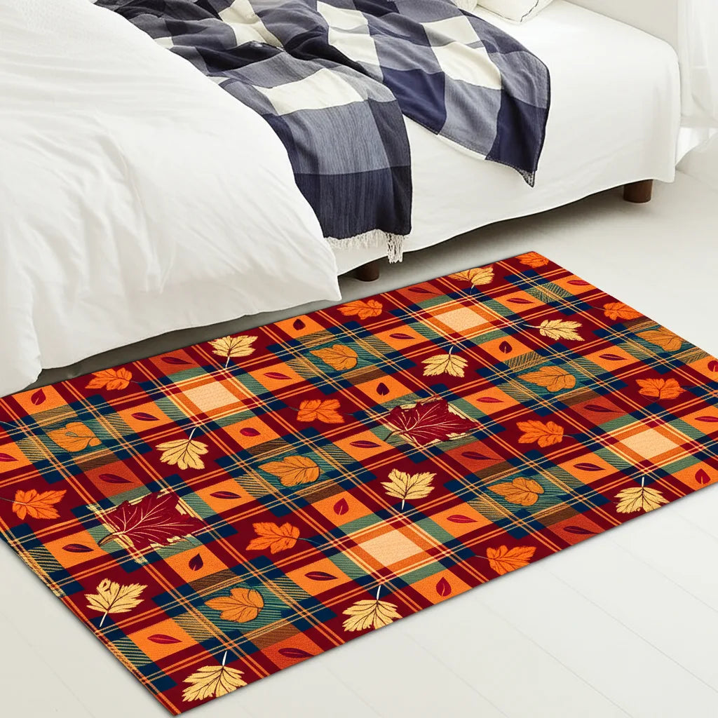 This rug features a beautiful fall-themed plaid pattern. Warm reds, oranges, and greens are interlaced with autumn leaves. This rug would add a cozy, seasonal touch to any room.
