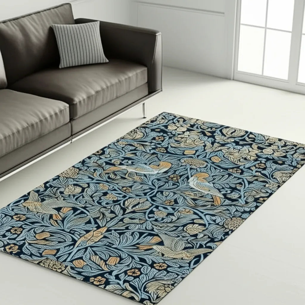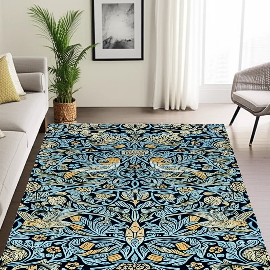 This rug features symmetrical rows of perched birds and floral elements. The rich color palette of gold and light blue hues, set against a deep navy backdrop, creates a visually captivating and sophisticated statement piece. Perfect for adding a touch of refined elegance to any room.