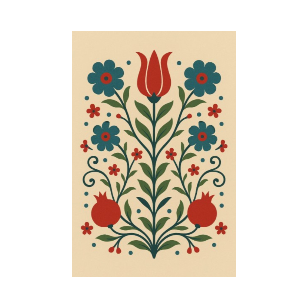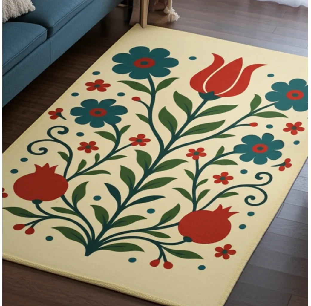 This rug features a beautiful folk-art floral design. With its stylized tulips, pomegranates, and flowers in shades of red, blue, and green, this rug will add a touch of whimsy to any space. The neutral background helps the colors pop, making it a versatile choice.