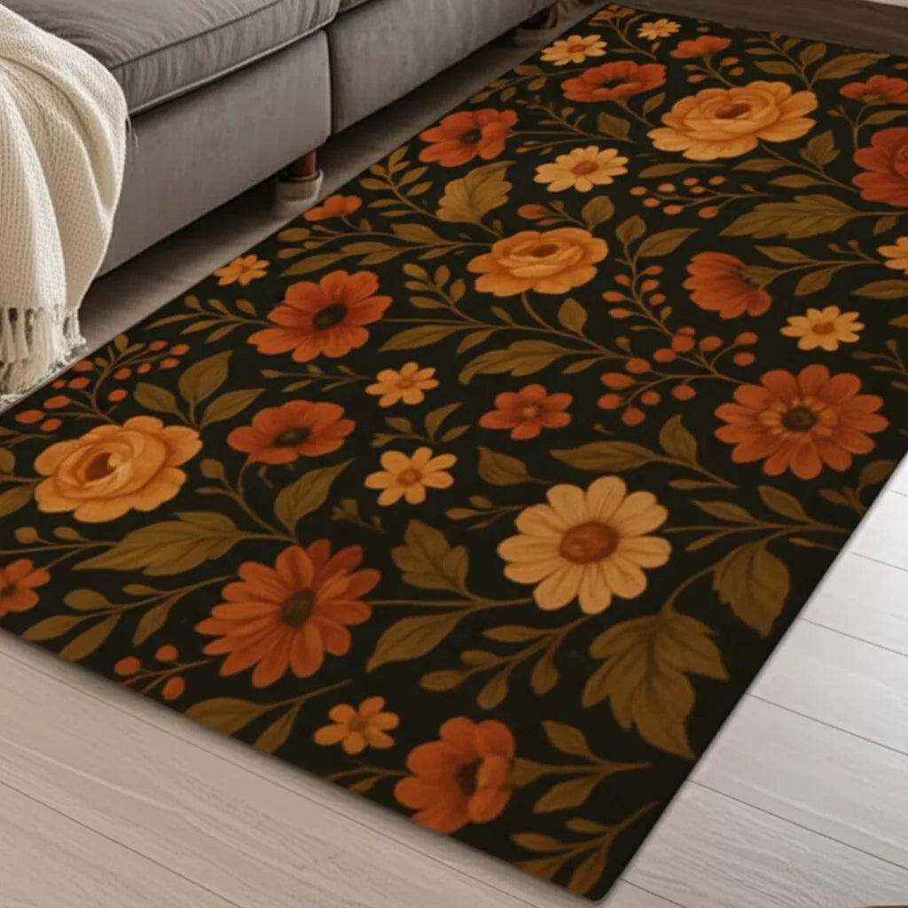 This rug features a painterly floral design with roses, daisies and foliage. The color palette includes dark brown with various shades of tan and orange. This rug would add a vintage touch to any room.
