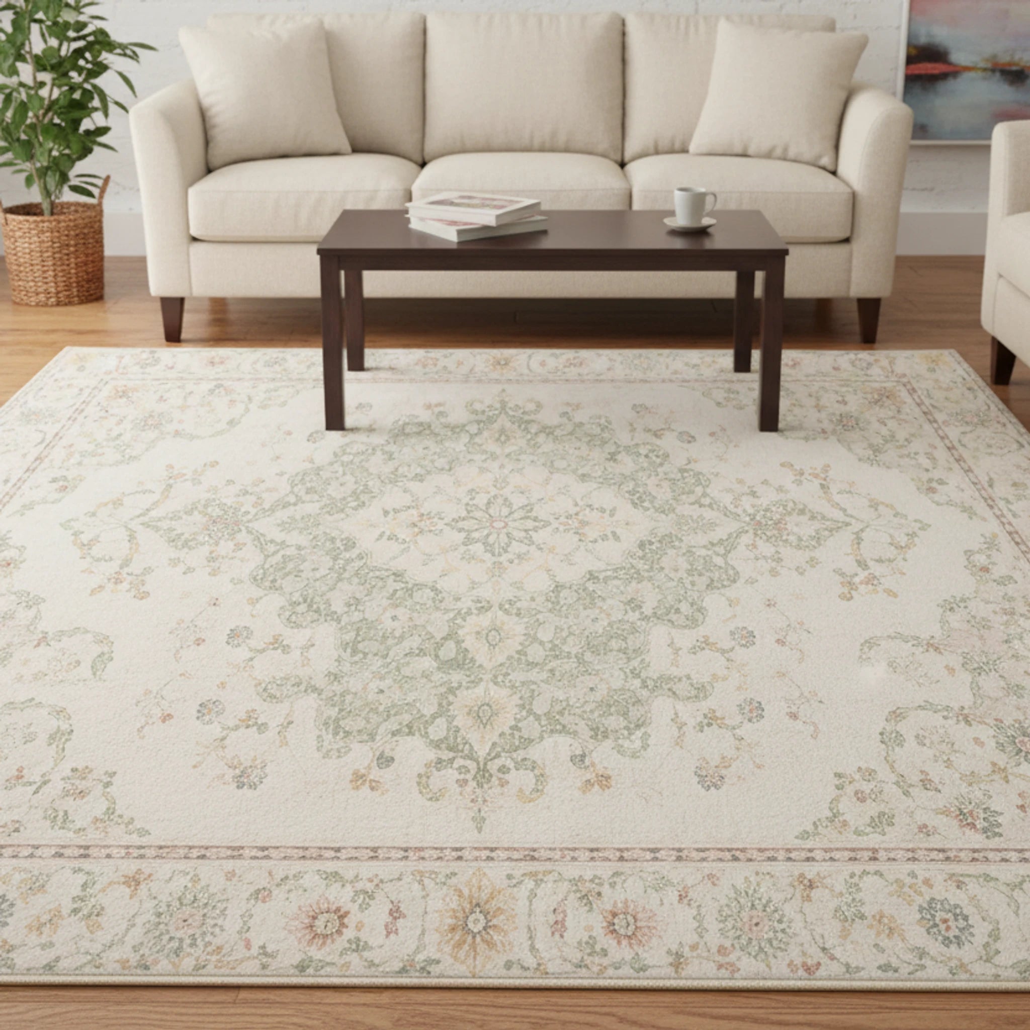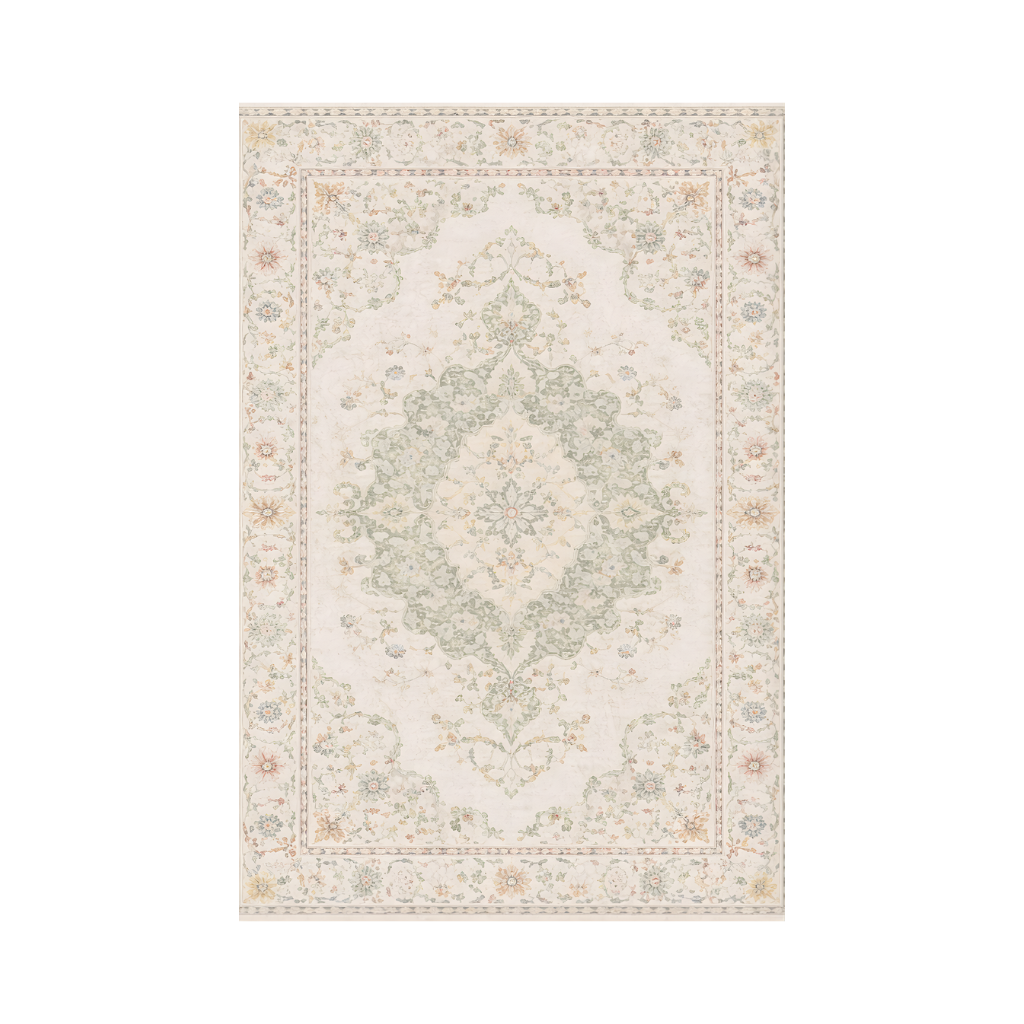 Bring vintage elegance to your living space with this floral medallion rug. Perfect for a living room, this area rug features scrolling foliage and arabesque patterns in creamy beige, pale green, and dusty taupe tones.