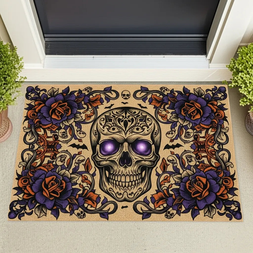 Welcome guests with spooky style. This doormat features a prominent skull with glowing purple eyes, surrounded by orange and purple roses. Skulls and bats fill the background, all on a tan colored backdrop.