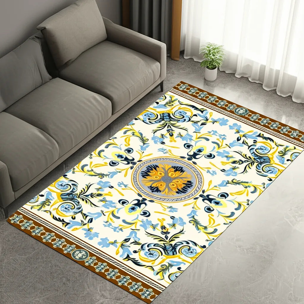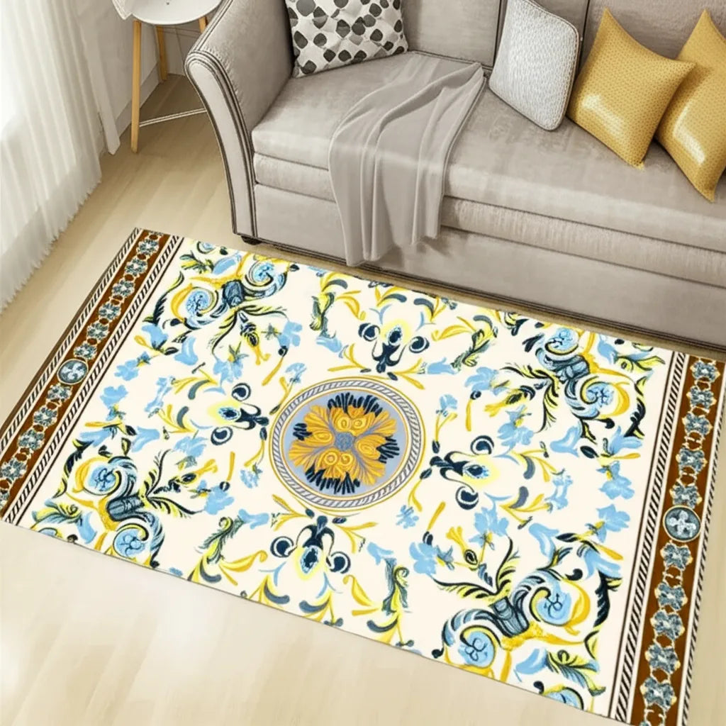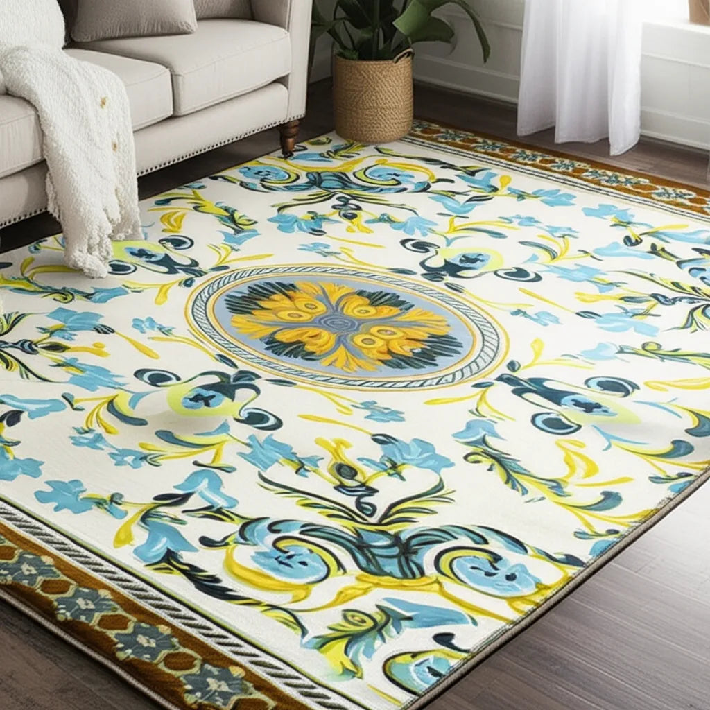 This rug features a gorgeous floral design in shades of yellow, light blue, and brown. The design has a vintage style, with a circular medallion at the center. It's perfect for adding a touch of elegance and warmth to any room.