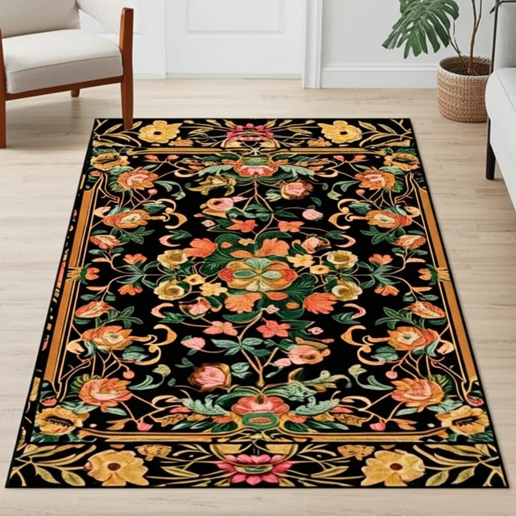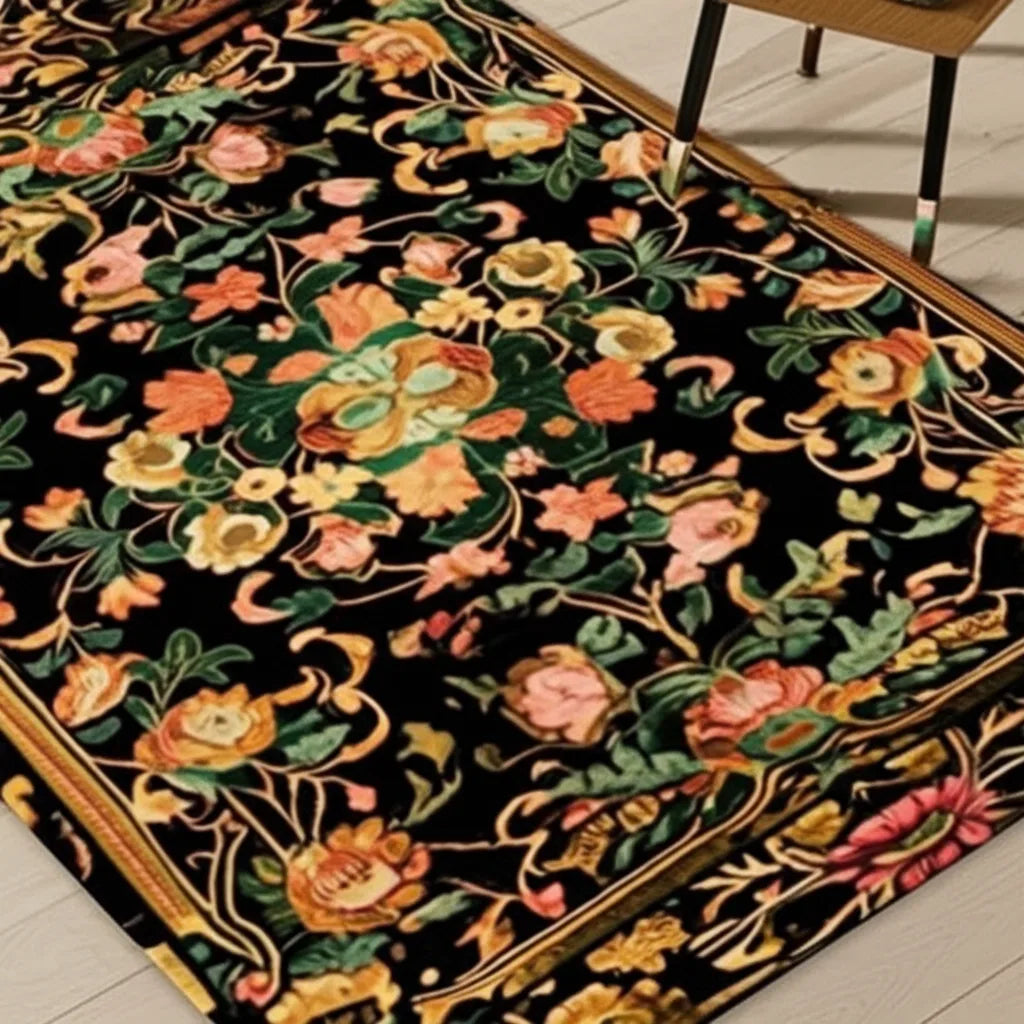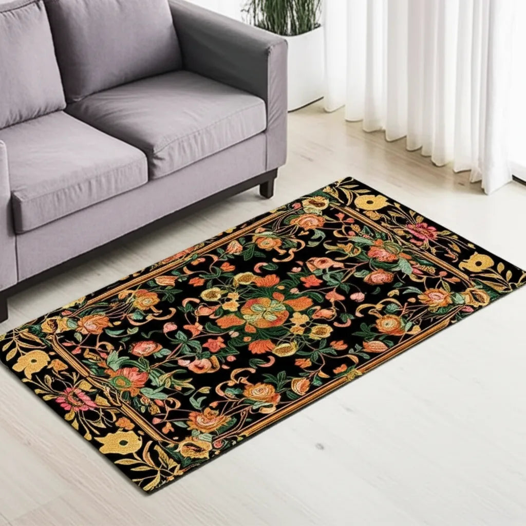 This rug features a floral vintage design with flowers, leaves, and vines in gold, pink, orange, and green tones. The black backdrop makes the colors pop, creating a sophisticated and elegant look. This rug is perfect for any room in your home.