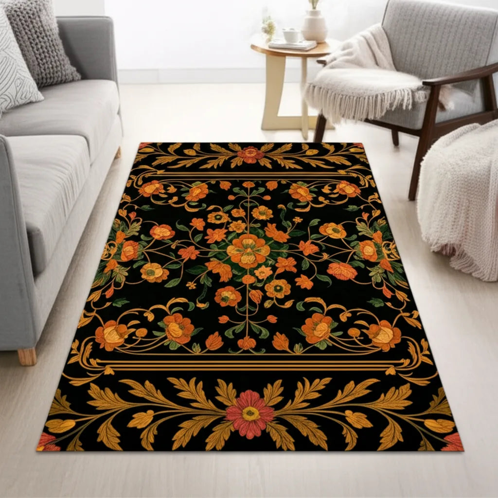 This rug features a symmetrical floral design with orange blossoms and leafy vines against a dark backdrop. The ornate pattern and rich colors add a touch of vintage elegance to any room. A perfect choice for a classic interior.