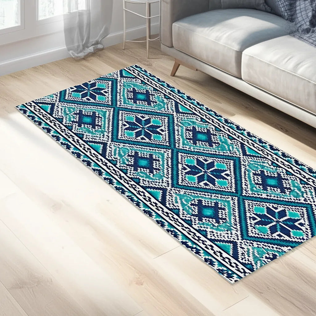 This rug features a geometric pixel design in shades of blue and white. The intricate pattern will add a touch of modern style to any room. It's a visually striking piece that offers a unique and contemporary look.