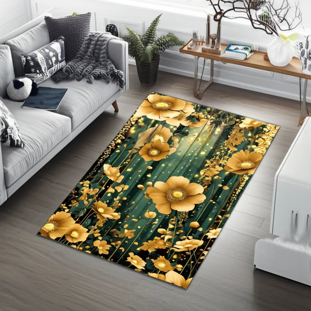 This rug features a stunning floral design with golden flowers and accents set against a dark teal backdrop. The intricate details and shimmering gold create a sense of luxury and elegance. This rug will add a touch of glamour and sophistication to any room.