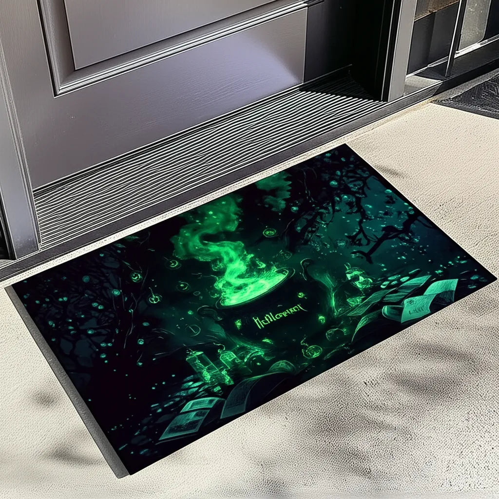 Welcome trick-or-treaters with this spooky Halloween doormat! It features a bubbling green cauldron, potion bottles and books, and ominous jack-o-lanterns, all in shades of dark green and black. The design adds a touch of eerie charm to any doorstep.