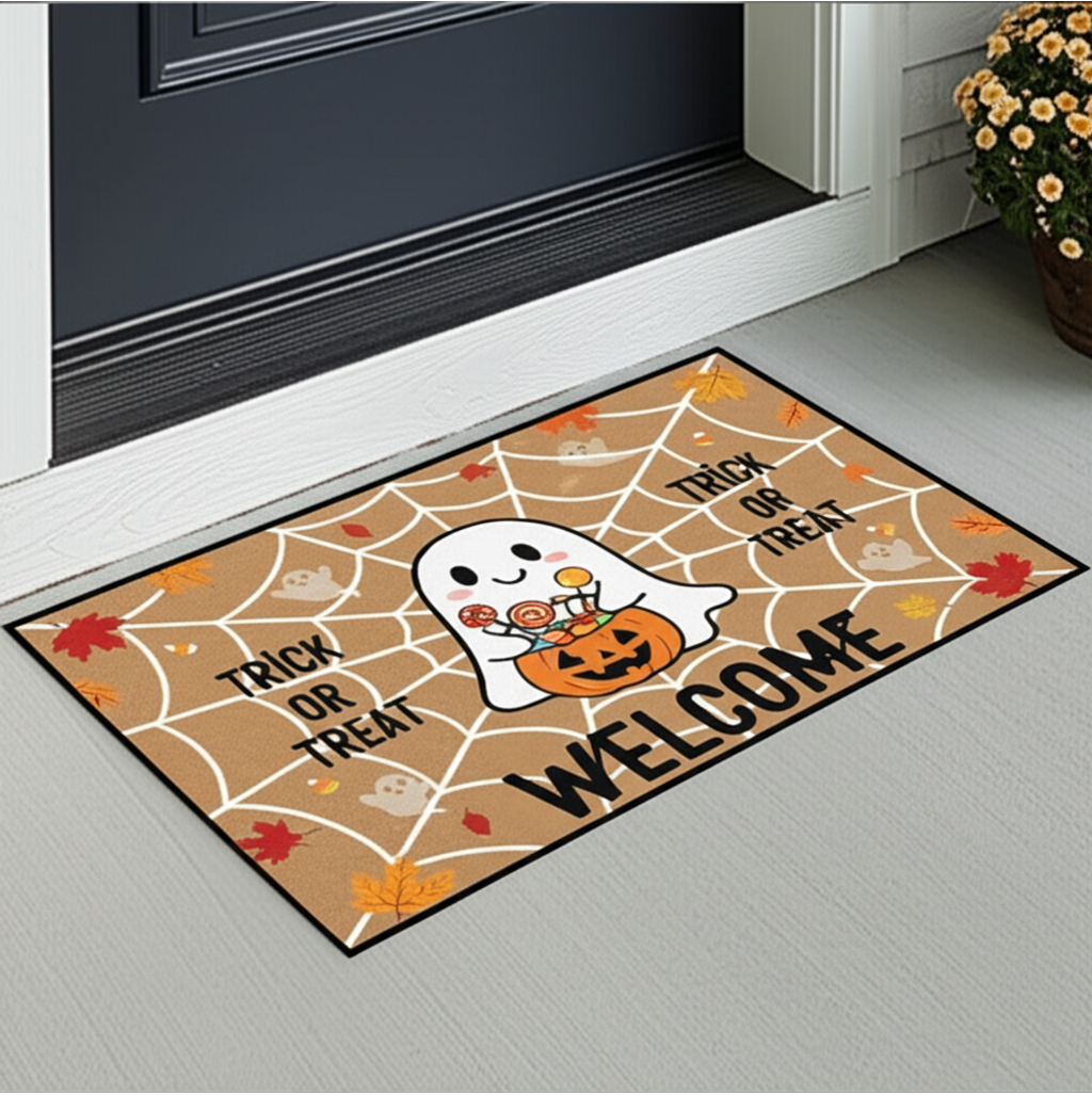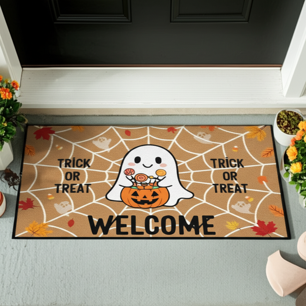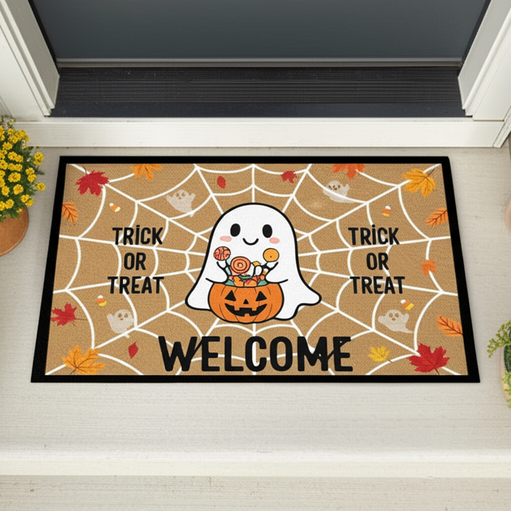 Welcome guests with this adorable Halloween doormat. It features a cartoon ghost holding a pumpkin filled with candy, on a tan background with a spiderweb design. The words "Trick or Treat" and "Welcome" are also incorporated into the design.