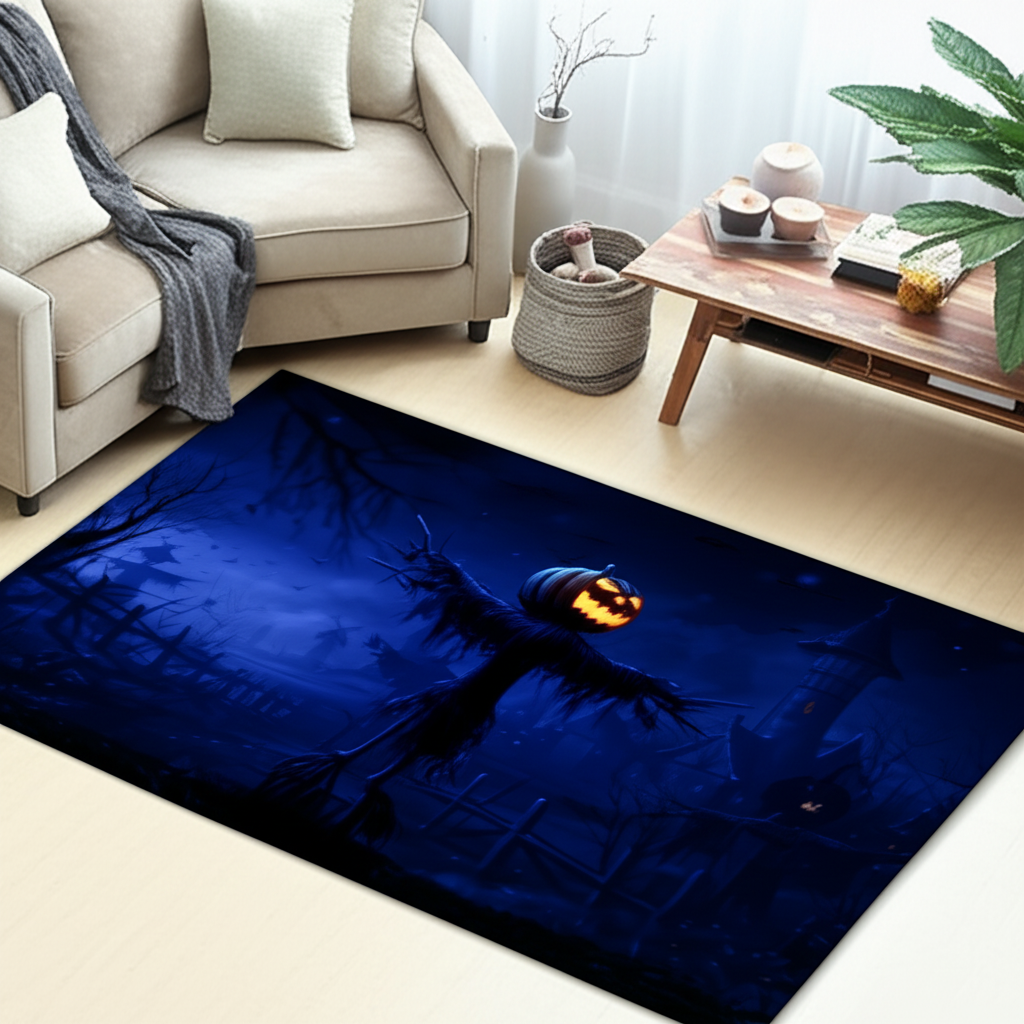 This Halloween rug will add a spooky touch to any room. The design features a pumpkin scarecrow in a dark and moody blue scene, complete with a haunted house in the background. This rug would be perfect for Halloween decorating.