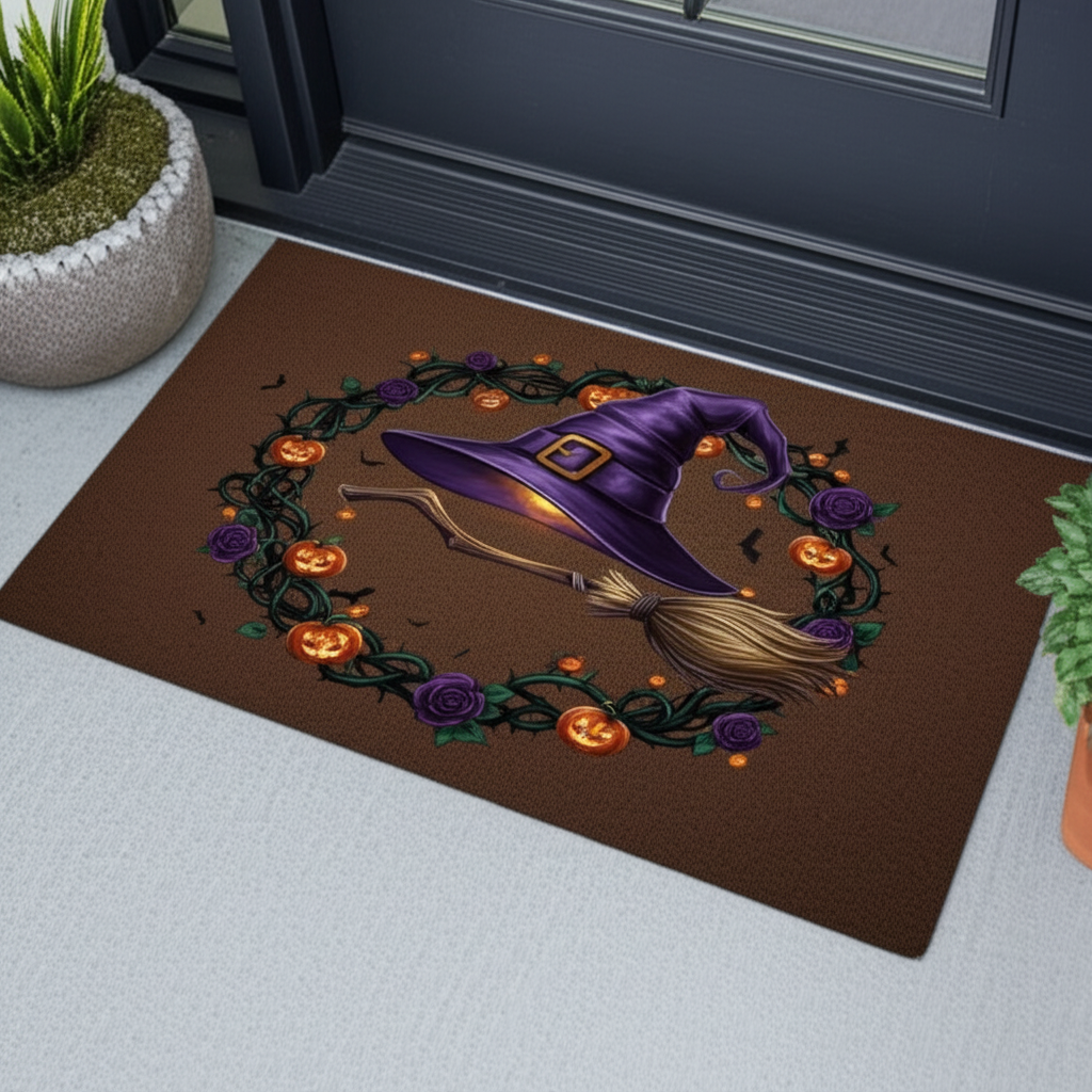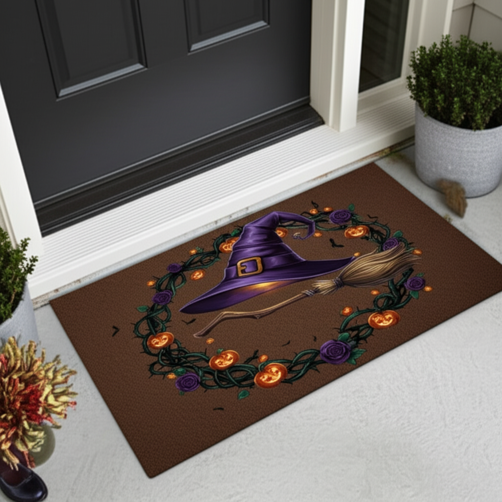 Welcome trick-or-treaters with this spooky doormat. It features a witch hat and broom surrounded by a Halloween wreath with roses and pumpkins. The colors are purple, orange, and green.
