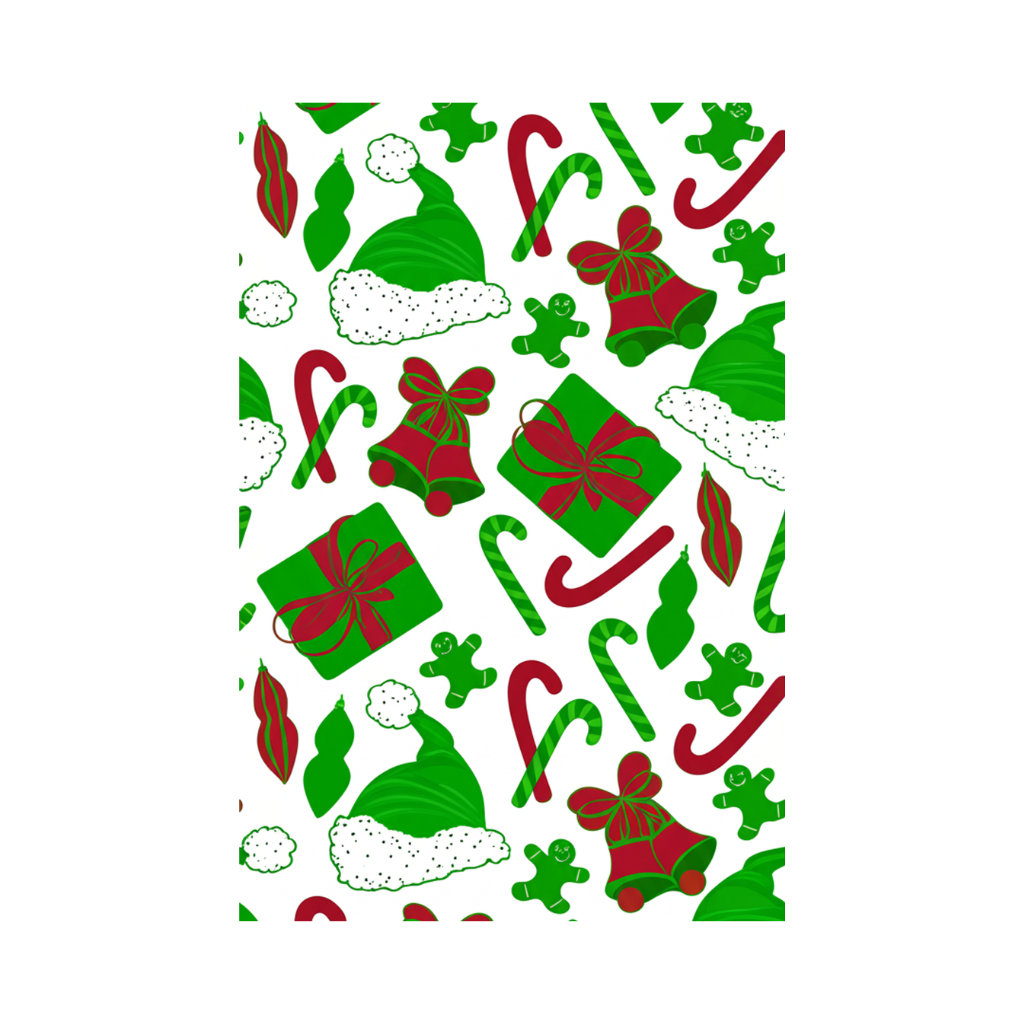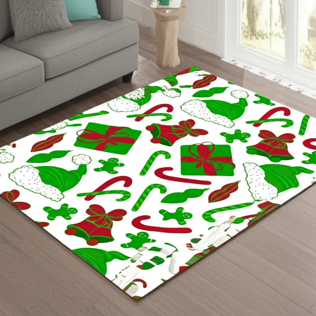 This rug will add festive style to your home. The pattern features classic holiday icons like candy canes, presents, bells, and Santa hats in shades of red and green. It will bring a cheerful touch to any room during the holidays.