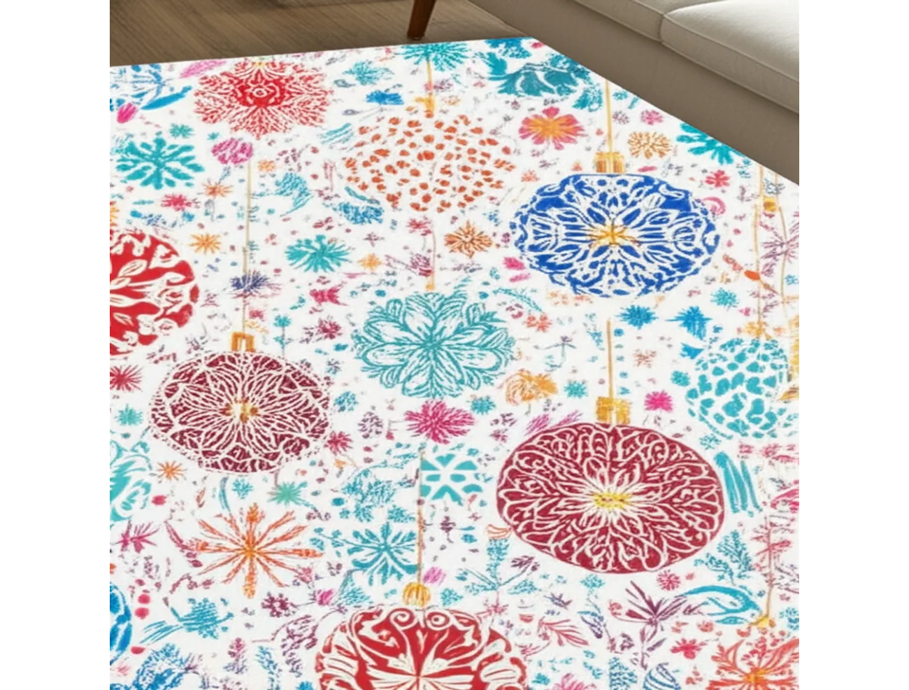 This fun rug features bright, festive ornaments and snowflakes. The cheerful design includes shades of red, orange, blue, and teal. It would be perfect for adding a pop of color and holiday cheer to any room.