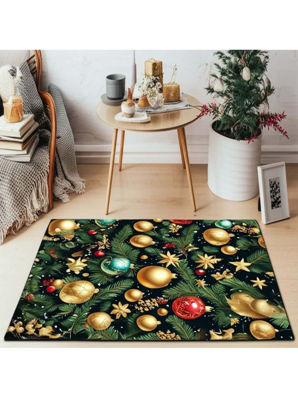 Adorn your floors with holiday cheer with this rug, featuring an arrangement of ornaments, pine branches, and snowflakes. The design incorporates gold, red, and teal ornaments, adding a touch of elegance and festivity to any room. Perfect for creating a warm and inviting atmosphere during the holiday season.