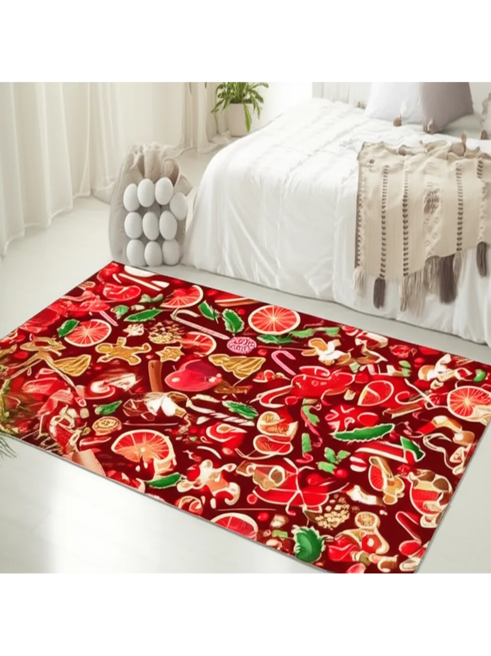 This rug features a cheerful holiday-themed pattern. Red apples, oranges, gingerbread people, candy canes, and pinecones are arranged against a deep red background, creating a warm and inviting look. Perfect for adding a festive touch to any room.
