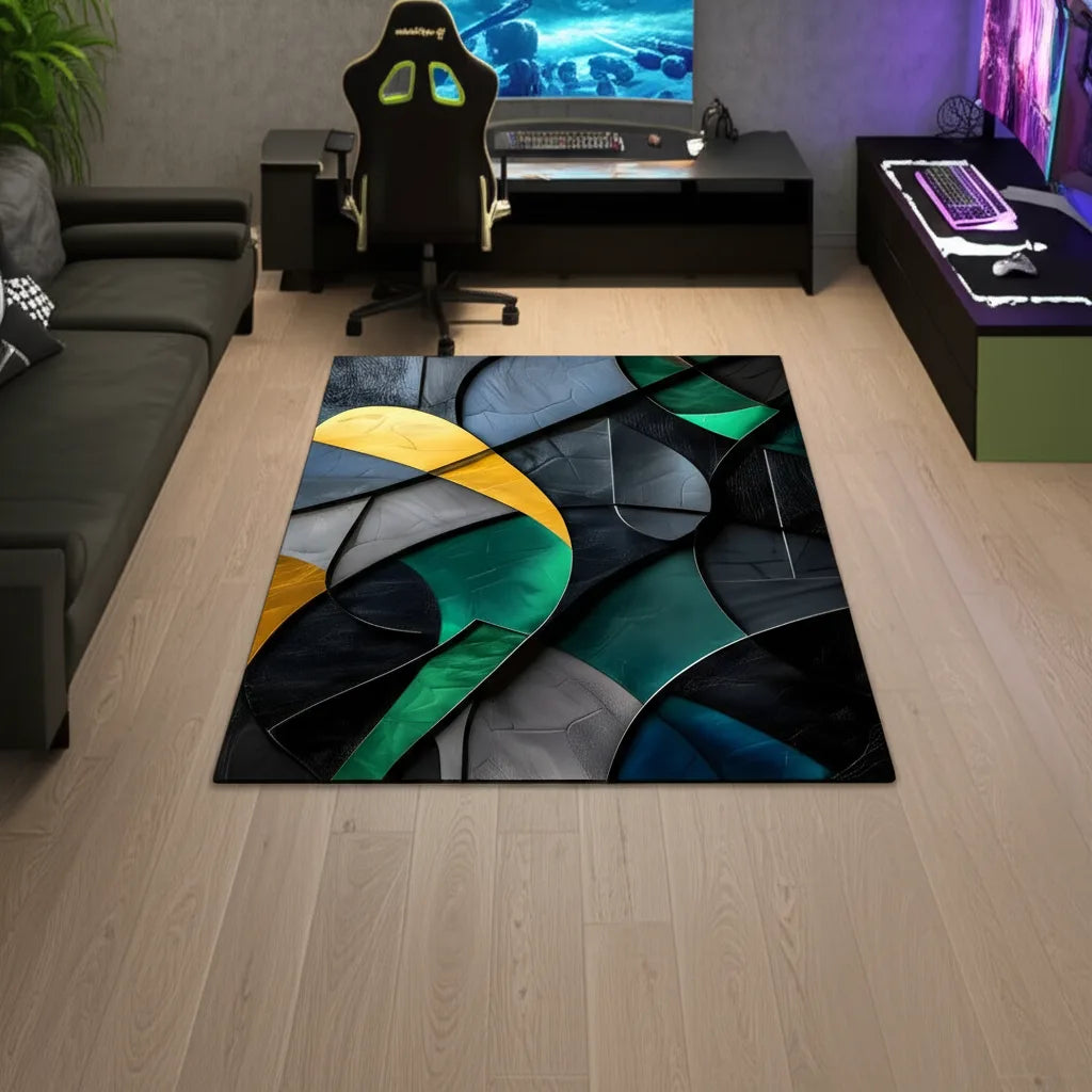 This rug features a striking geometric design in shades of gray, black, gold, and green. The shapes are arranged in a dynamic and eye-catching pattern, perfect for adding a modern touch to any room. It is sure to be a conversation starter.