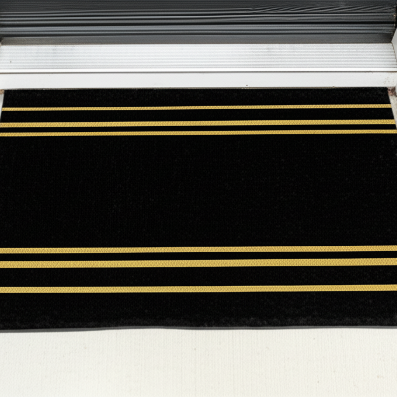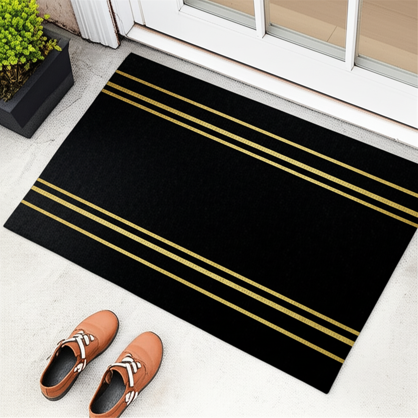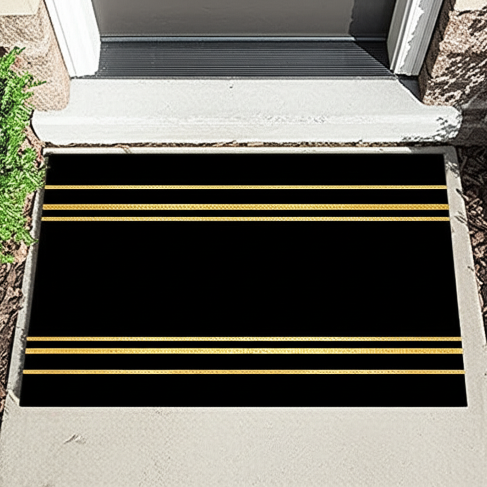 Welcome guests with a touch of modern elegance with this stylish doormat. Featuring a sleek black background accented with parallel gold stripes, this doormat adds a sophisticated touch to any entryway. Perfect for both indoor and outdoor use, it's the ideal way to make a lasting first impression.