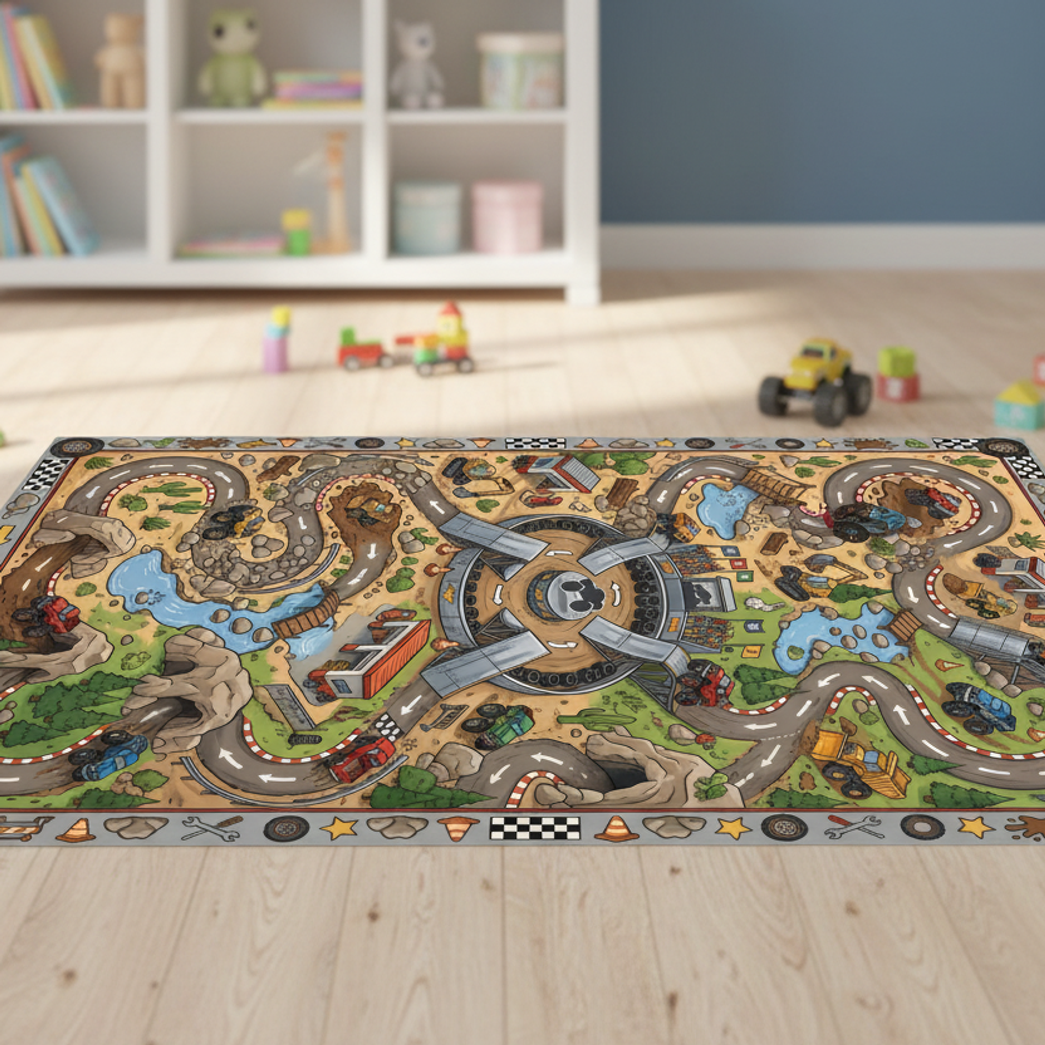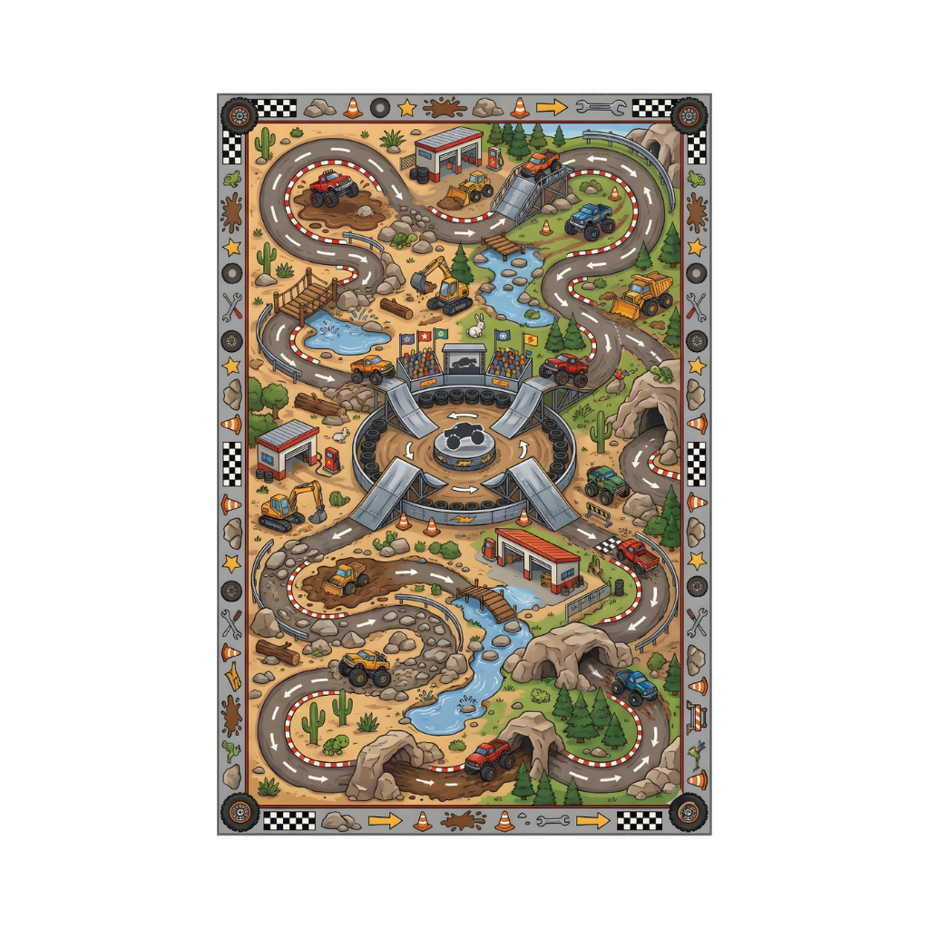 Fuel your little one's imagination with this Monster Truck Adventure Eco Rug! Imagine a vibrant desert landscape filled with monster trucks and construction vehicles, creating a playful race track right in their room. The playful design and durable, eco-friendly materials make it perfect for boys who love action and adventure. I've made this rug with recycled fibers, so it's soft and safe for your little ones. Bring the thrill of the construction zone into your home! It's a great gift for birthdays or any special occasion, guaranteed to ignite their creativity and playtime fun.