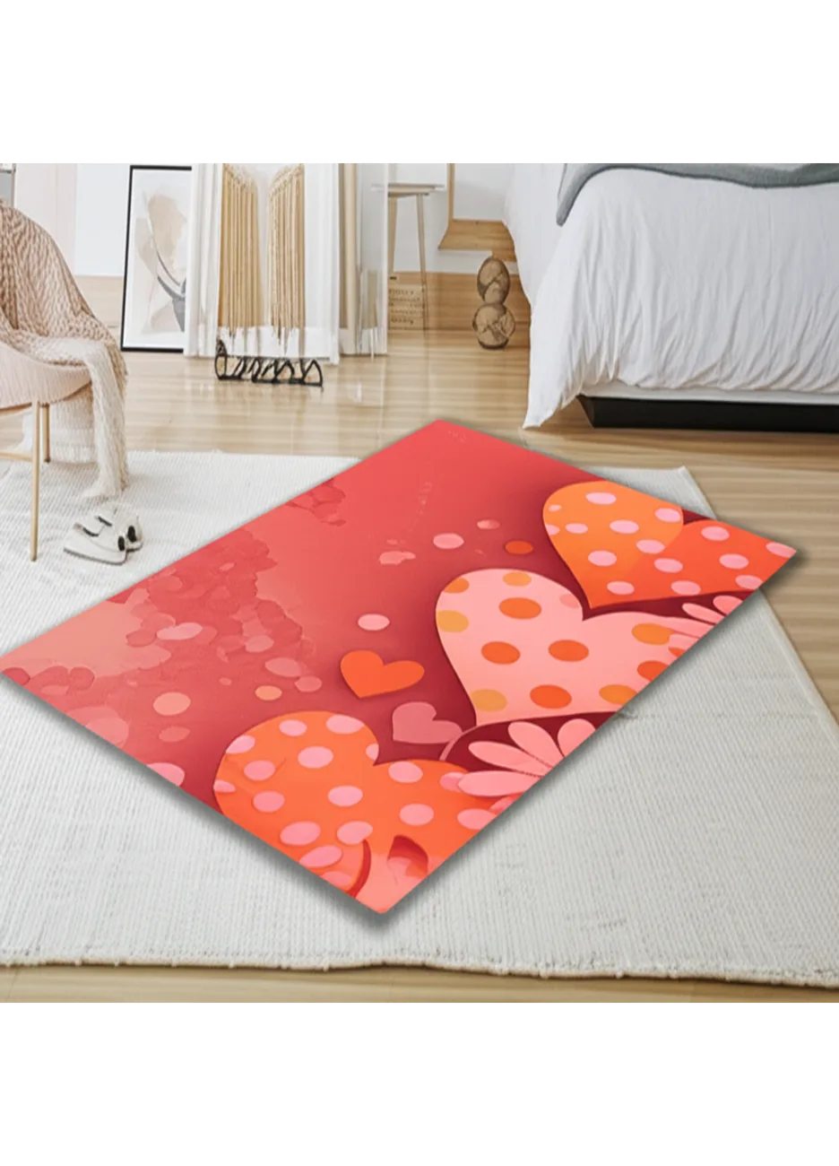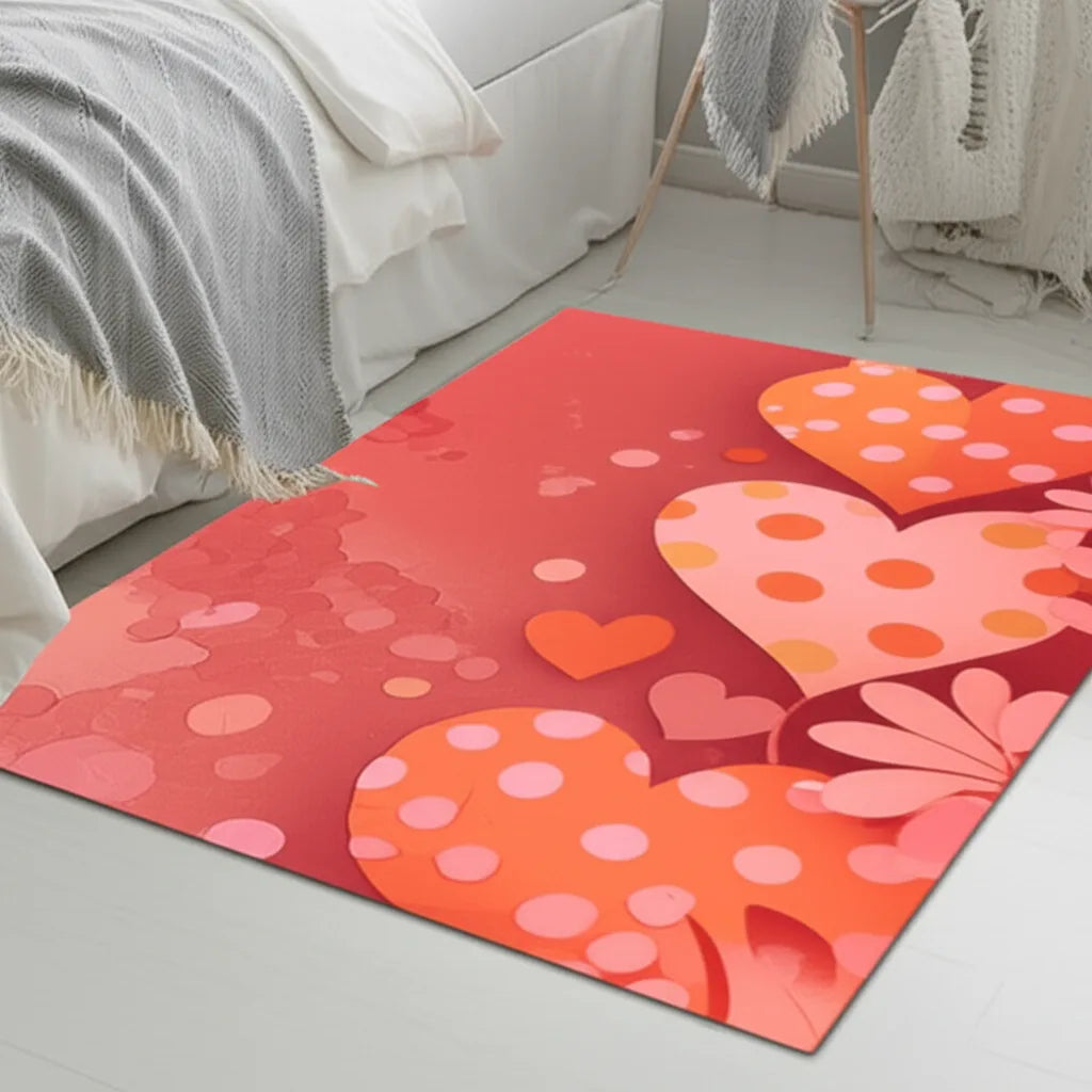 This adorable rug features delightful polka dot hearts in orange and pink hues. The design has a playful, romantic feel that would brighten up any space. It's a sweet and charming addition to your home decor.