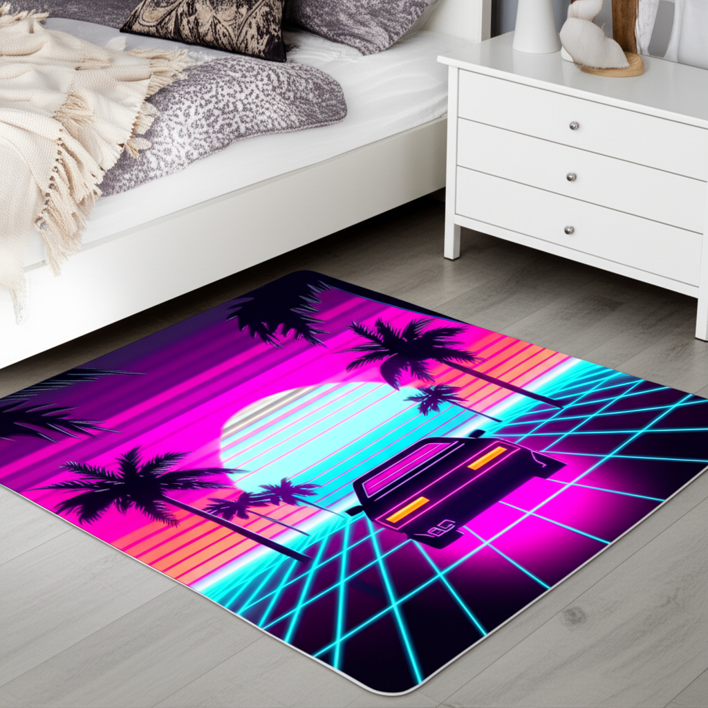 Transform your living space into a vibrant retro paradise with our Retro Wave Premium Rug. This stunning rug features a nostalgic synthwave design, complete with neon grids, palm trees silhouetted against a setting sun, and a classic 80s car. The vivid colors and retro aesthetic will add a unique and stylish touch to any room.