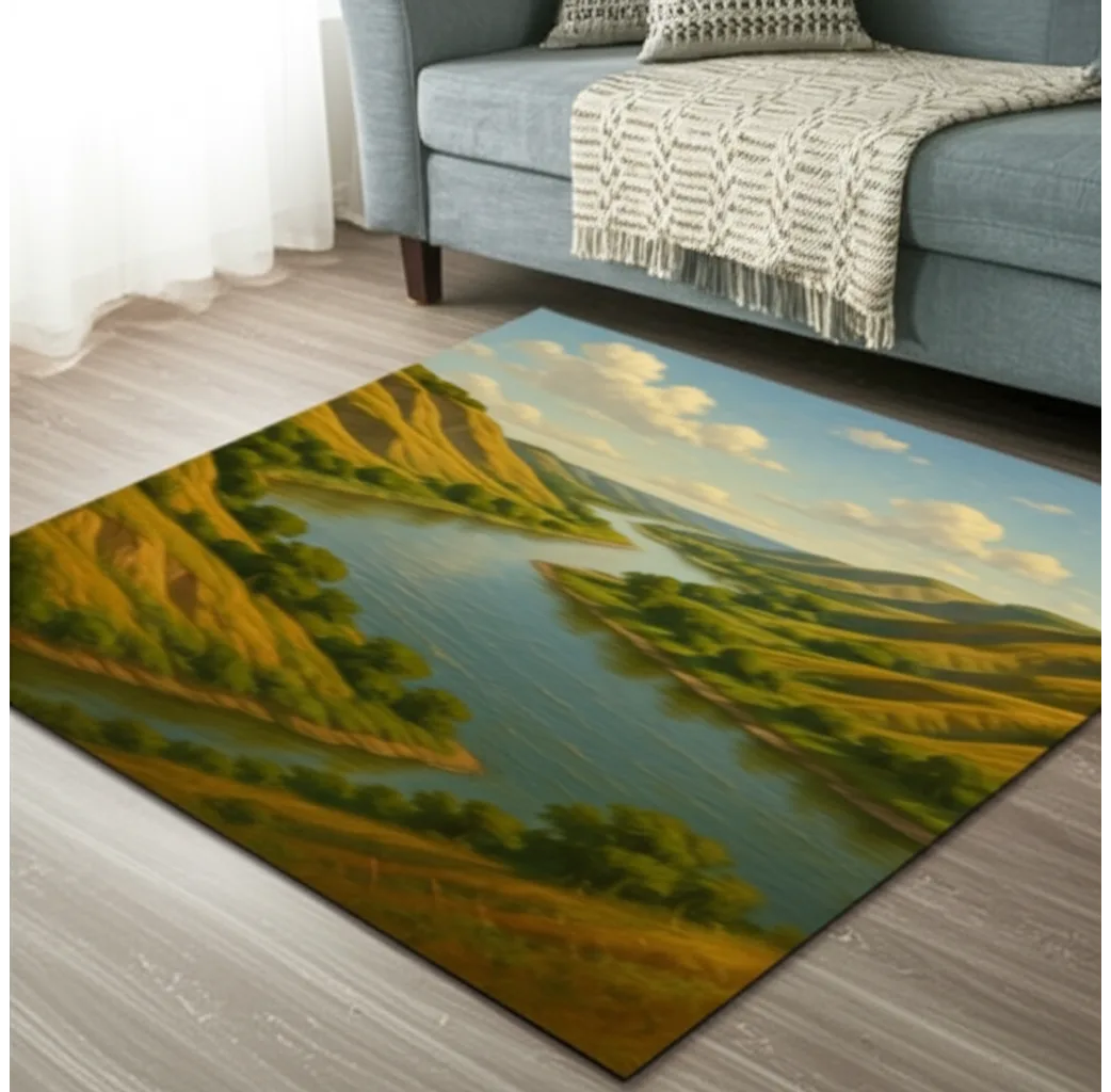 Imagine this stunning vista underfoot. The golden hues of the valley and the cool blues of the river create a serene and inviting atmosphere. This rug will add a touch of nature-inspired beauty to any room.