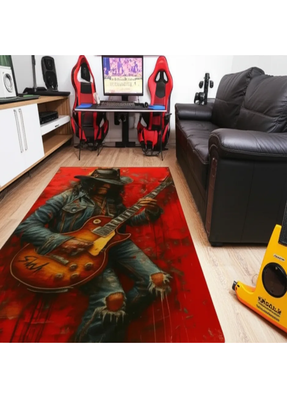 This Slash-inspired rug design features a painterly style with a bold color palette of reds, blues, and browns. The iconic guitarist in his signature hat, denim, and guitar becomes a rock-and-roll statement piece for your floor. It will bring an artistic edge to any room.