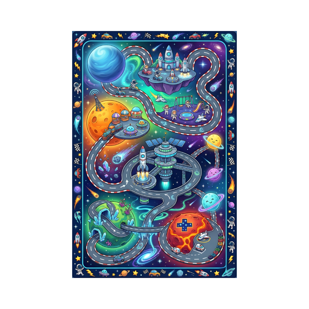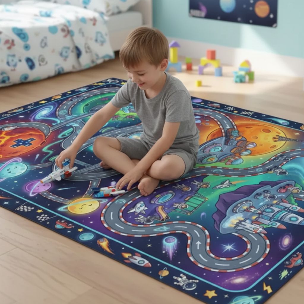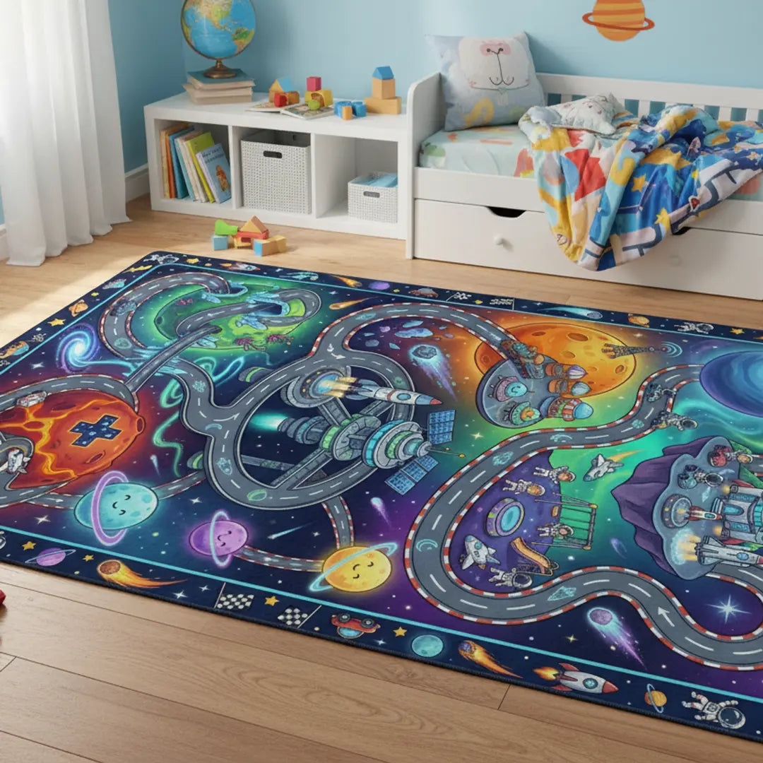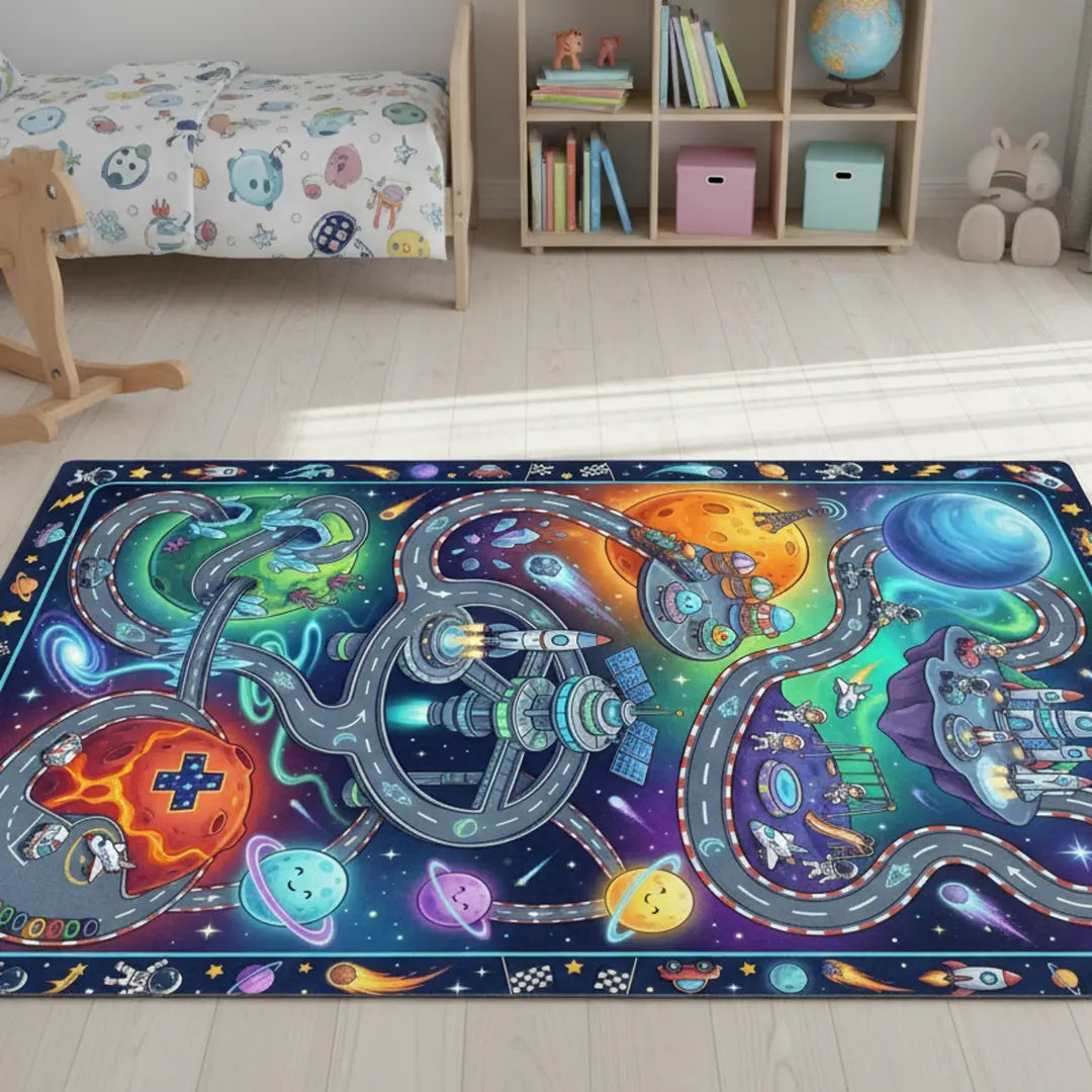 Ignite your child's imagination with this whimsical Space Adventure Eco Rug! Perfect for a kids room, this rug features playful planets, rockets, and astronauts racing across a star-filled sky. The deep space blue, vibrant orange, and cheerful greens create a fun and adventurous atmosphere. Crafted with eco-friendly materials, it's soft, durable, and perfect for little explorers. I make each rug with care, so it feels like a warm hug underfoot. It's an amazing gift for birthdays, holidays, or just because! This rug brings both style and comfort to any nursery or playroom. Give the gift of adventure!